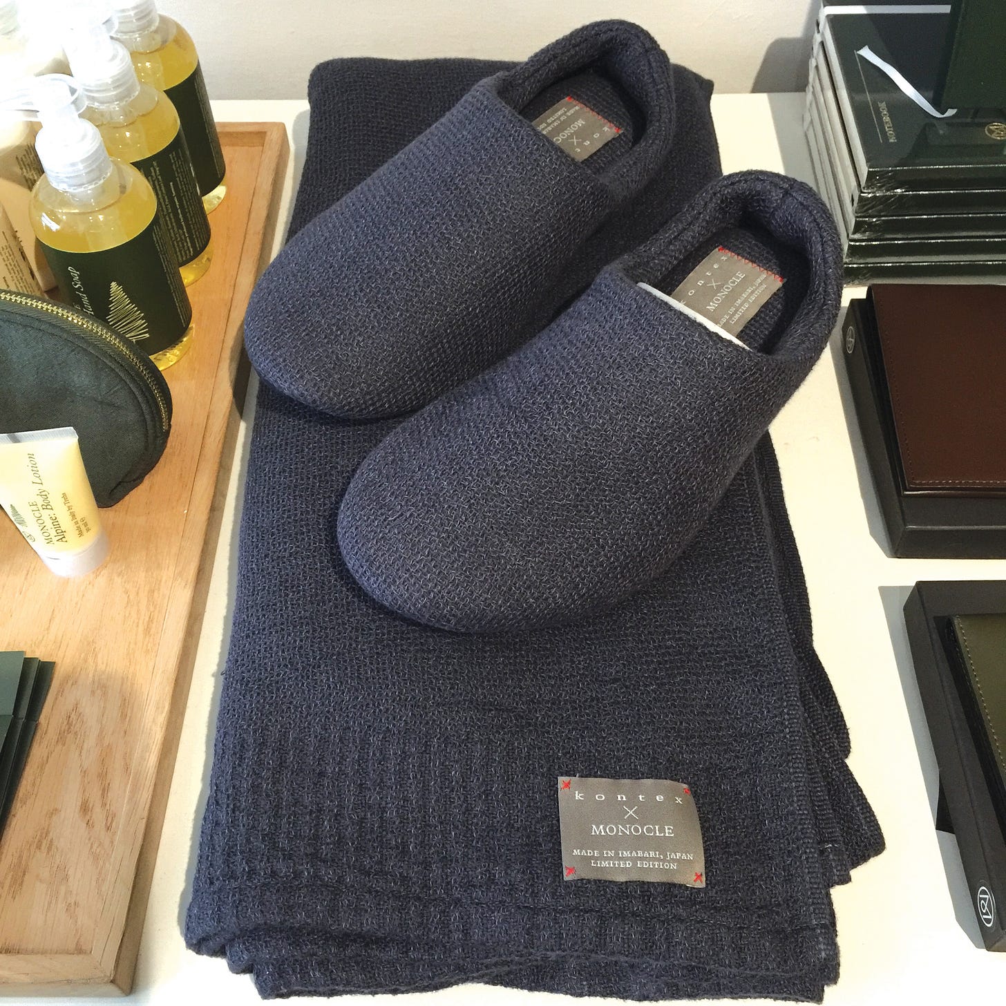 더 모노클 숍도 모노클 잡지처럼 기존의 편집숍이나 제품 판매 매장과 차이가 있습니다. 우선 매장의 크기가 9m2 정도로 리테일 매장이라고 하긴엔 작은 편입니다. 매장을 운영하는 직원의 개인 사무실 공간에 제품을 놓고 판매하는 듯한 분위기로, 다양한 제품을 취급할 수 없는 구조입니다. 게다가 한 번에 4명이 들어가면 쇼핑은커녕 함께 서있기도 힘들만큼 좁아 다수의 고객에게 팔 수도 없는 환경입니다. 유동 인구를 대상으로 대량 판매를 하려는 접근과는 거리가 멉니다. 또 다른 특징은 모노클의 안목으로 선별한 제품들을 판매하는데 하나같이 컬래버레이션 표시가 붙어 있습니다. 특정 브랜드의 제품을 갖다 놓고 유통만 시키는 방식이 아니라 모노클이 애정하는 브랜드들과 기획을 함께해 컬래버레이션 제품을 만들어 판매하는 것입니다.