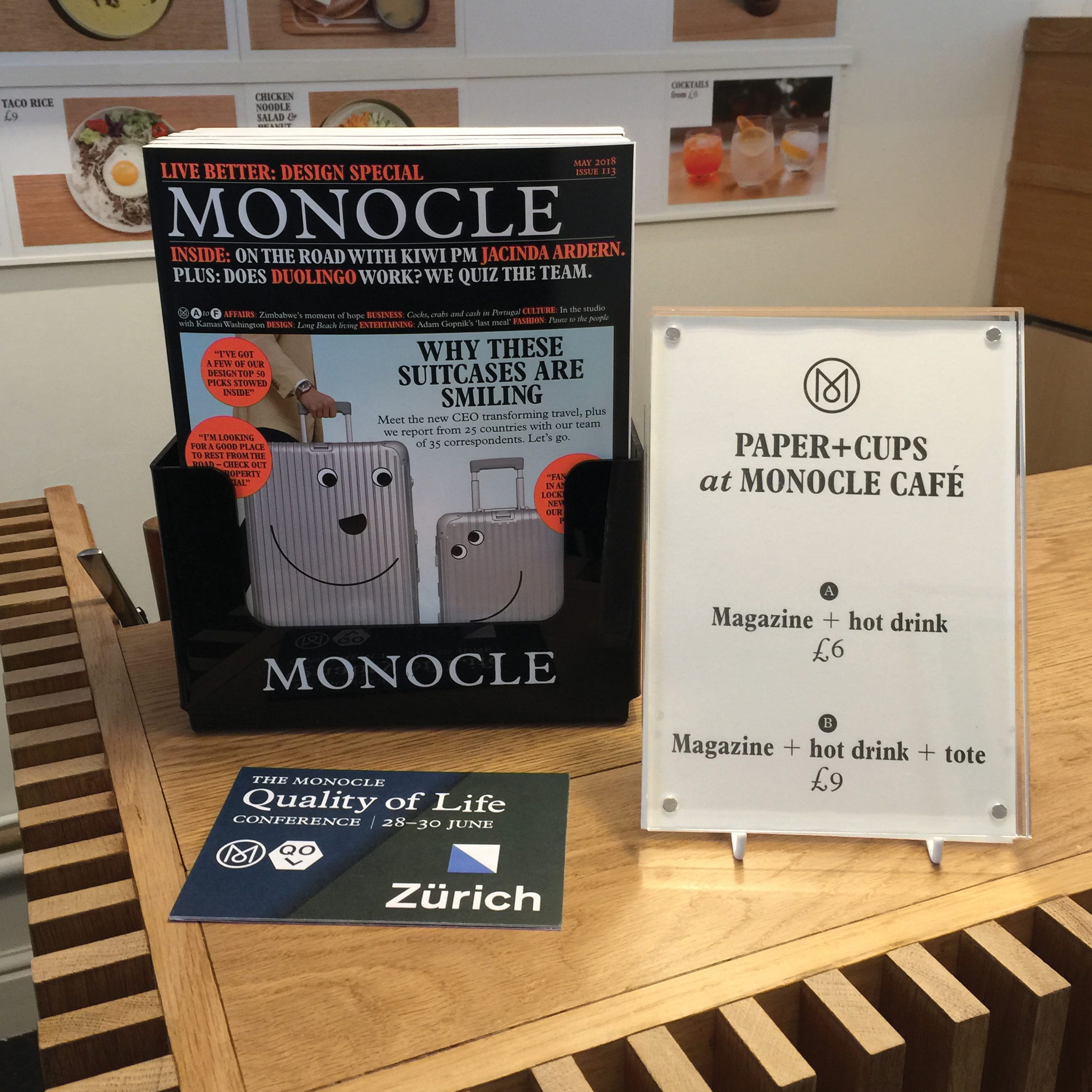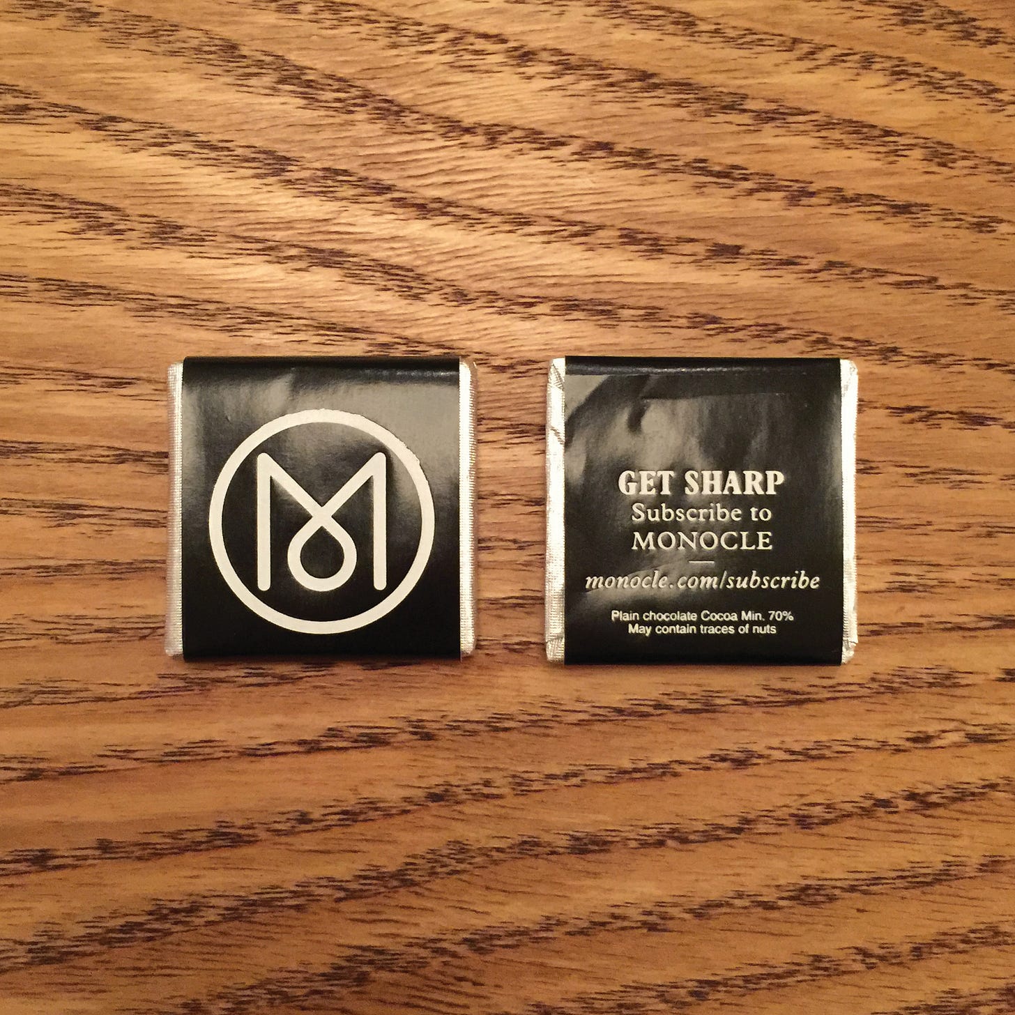 모노클이 카페에서 그들의 비즈니스를 알리는 방법은 홍보 포스터 외에도 다양합니다. 초콜릿 뒷면에 모노클 정기 구독에 대한 정보를 담아 초콜릿을 공짜로 나눠줍니다. 구매 전환율은 측정하기 어렵겠지만 정기 구독에 대한 내용을 달콤하게 전달하기에 홍보에 따른 부정적 반응을 최소화할 수 있습니다. 또한 모노클 잡지와 음료를 세트로 묶어 6파운드(약 9,000원)에 판매합니다. 모노클 잡지가 6파운드이니 잡지를 사면 2.5파운드(약 3,800원)의 음료를 공짜로 제공하는 셈입니다. 커피를 마시러 온 고객들에게 음료는 그냥 드릴테니 모노클 잡지를 읽어보라고 권유하는 가격 구성입니다.