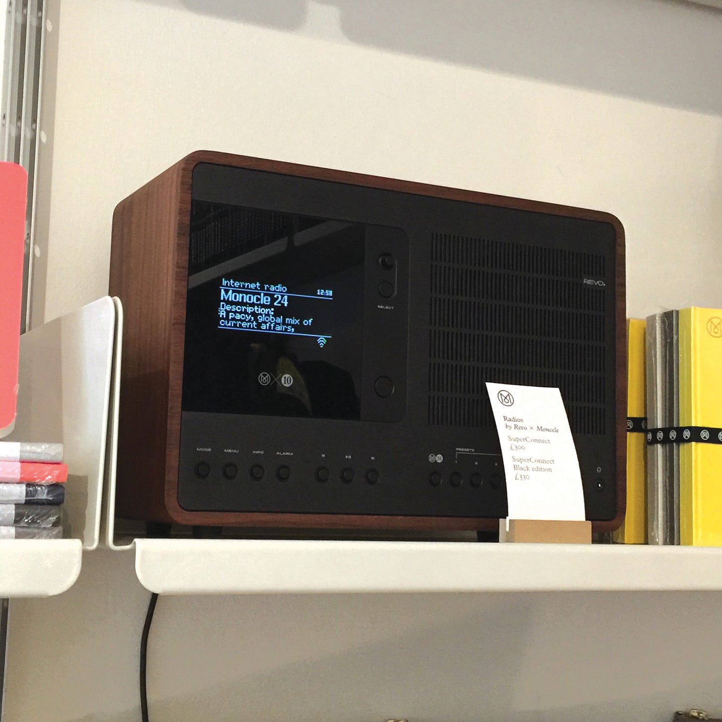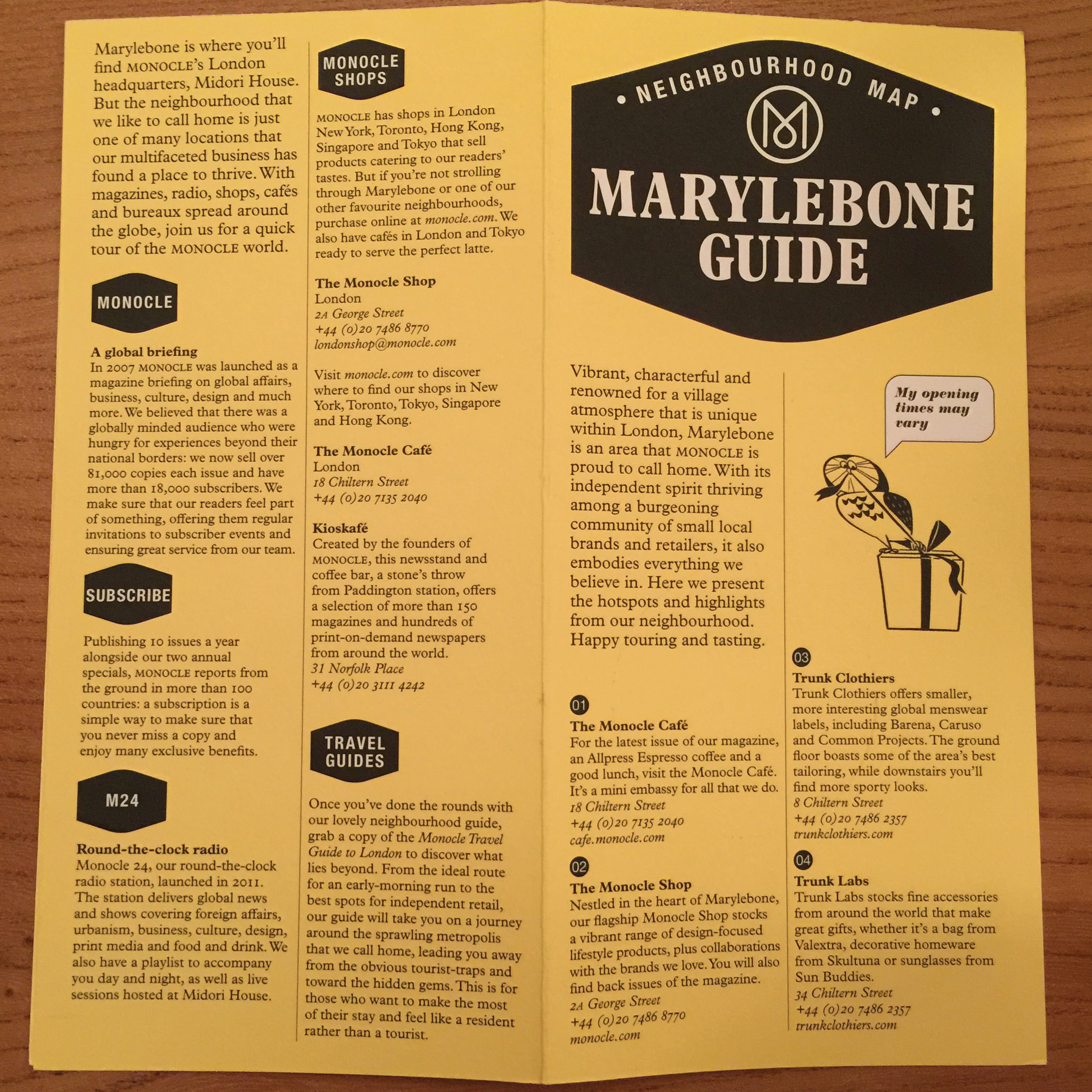 키오스카페에서는 잡지와 신문 뿐만 아니라 샴푸, 칫솔, 치약, 로션, 양말, 펜, 우산 등 여행에 필요한 제품들도 함께 판매합니다. 세계에 퍼져있는 타깃 고객들이 런던 여행을 하면서 들렀을 때, 급하게 여행 용품을 필요로 할지도 모르기 때문입니다. 잡지 매장에서 여행 용품을 판매하는 것이 어색할 수도 있지만, 모노클의 타깃 고객 특성을 고려하면 어울리는 조합입니다.