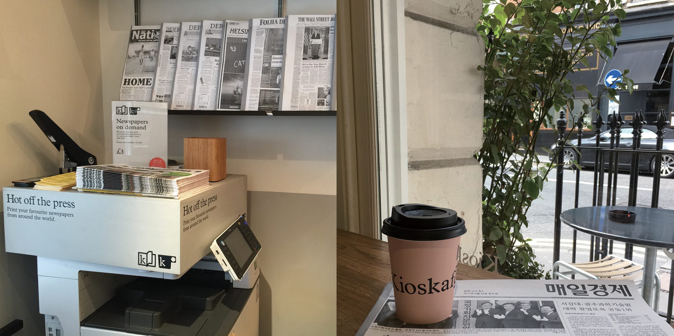 키오스카페는 이름에서 유추할 수 있듯이 신문과 잡지, 그리고 간단한 스낵 등을 파는 간이형 점포인 키오스크(Kiosk)와 카페를 결합한 공간입니다. 유럽 도시에서 흔히 볼 수 있는 키오스크를 80m2의 공간에 모노클 방식으로 재해석한 것입니다. 모노클에서 만든 콘텐츠만 소개하는 더 모노클 카페와 달리 키오스카페에서는 모노클뿐만 아니라 전 세계에서 엄선한 100여 종의 잡지와 신문을 제안하며 판매합니다. 또한 더 모노클 숍과 더 모노클 카페가 매릴번(Marylebone) 지역에 위치한 모노클 본사 근처에 모여있는 반면 키오스카페는 교통의 요지 패딩턴(Paddington) 지역에 있습니다. 그동안의 모노클의 시도와는 다른 행보입니다.