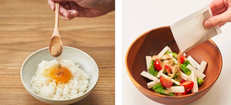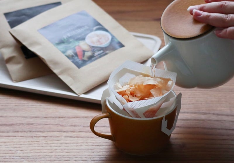 마시는 방법도 간편했어요. 컵에 드립 필터를 올리고, 그 위에 건조 채소와 분말 엑기스, 참치 등의 플레이크를 넣은 다음 뜨거운 물을 핸드드립 커피처럼 여러 번에 걸쳐 부어주면 끝이죠. 집에서뿐만 아니라 밖에서도 간편하게 즐길 수 있어요. 2017년 출시한 ‘핸드드립 다시 채소 우마미’는 양파, 당근, 샐러리, 감자, 생강 등 5종류의 채소에 메지마구로(새끼 다랑어)의 하나케즈리(얇은 가쓰오부시 조각)를 조합해, 출시와 동시에 큰 인기를 끌었어요.