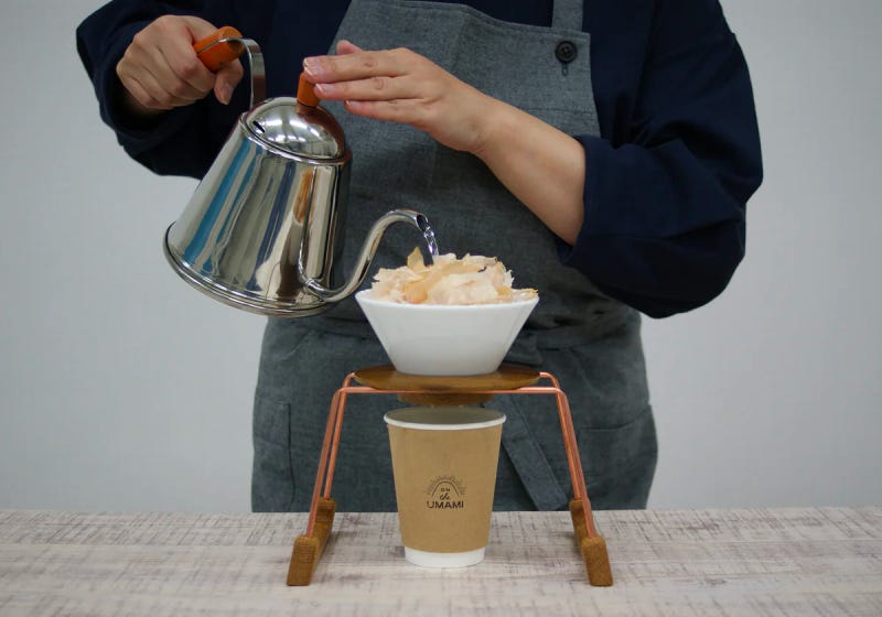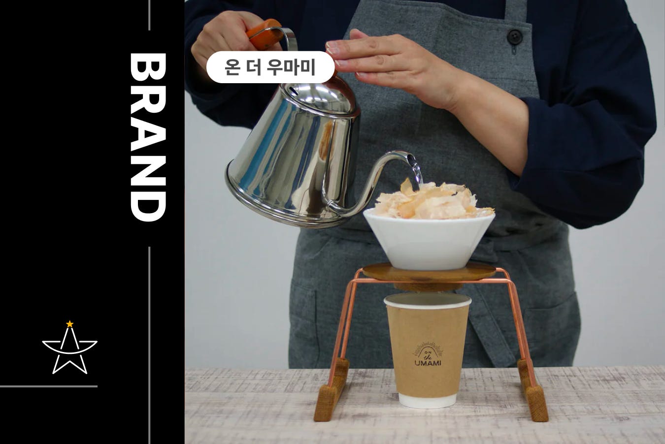 그렇게 해서 우마미를 브랜드 컨셉으로 내세운 온 더 우마미는 첫 상품으로 평범치 않은 아이디어를 내놔요. 핸드드립 커피처럼 뜨거운 물을 부어 천천히 내려 먹는, 이름하여 핸드드립 다시 육수죠. 왜 커피였나고요? 커피 하면 떠오르는 이미지는 모던하고 젊으면서도 고풍스러운 분위기예요. 여기에다가 시대를 타지 않을 뿐더러 매일 커피를 즐기는 사람도 많죠. 온 더 우마미가 갖고 싶어하는 다시 육수의 이미지가 정확히 커피와 일치했던 거예요.