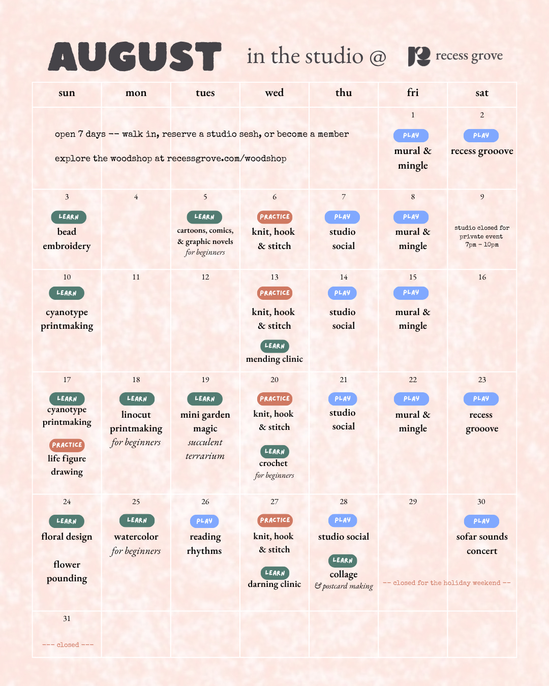 그 주인공은 스스로를 ‘예술과 커뮤니티의 회복을 위한 성역’이라 칭하는 ‘리세스 그로브(Recess grove)’예요. 리세스 그로브는 배우고(Learn), 놀고(Play), 연습한다는(Practice) 관점에서 구슬 자수, 만화 그리기, 뜨개질, 꽃꽂이 등 다양한 아트 클래스를 운영하는 공방이에요. 매일 다채로운 수업이 열려 취미나 관심사에 따라 골라 듣는 재미가 있죠.