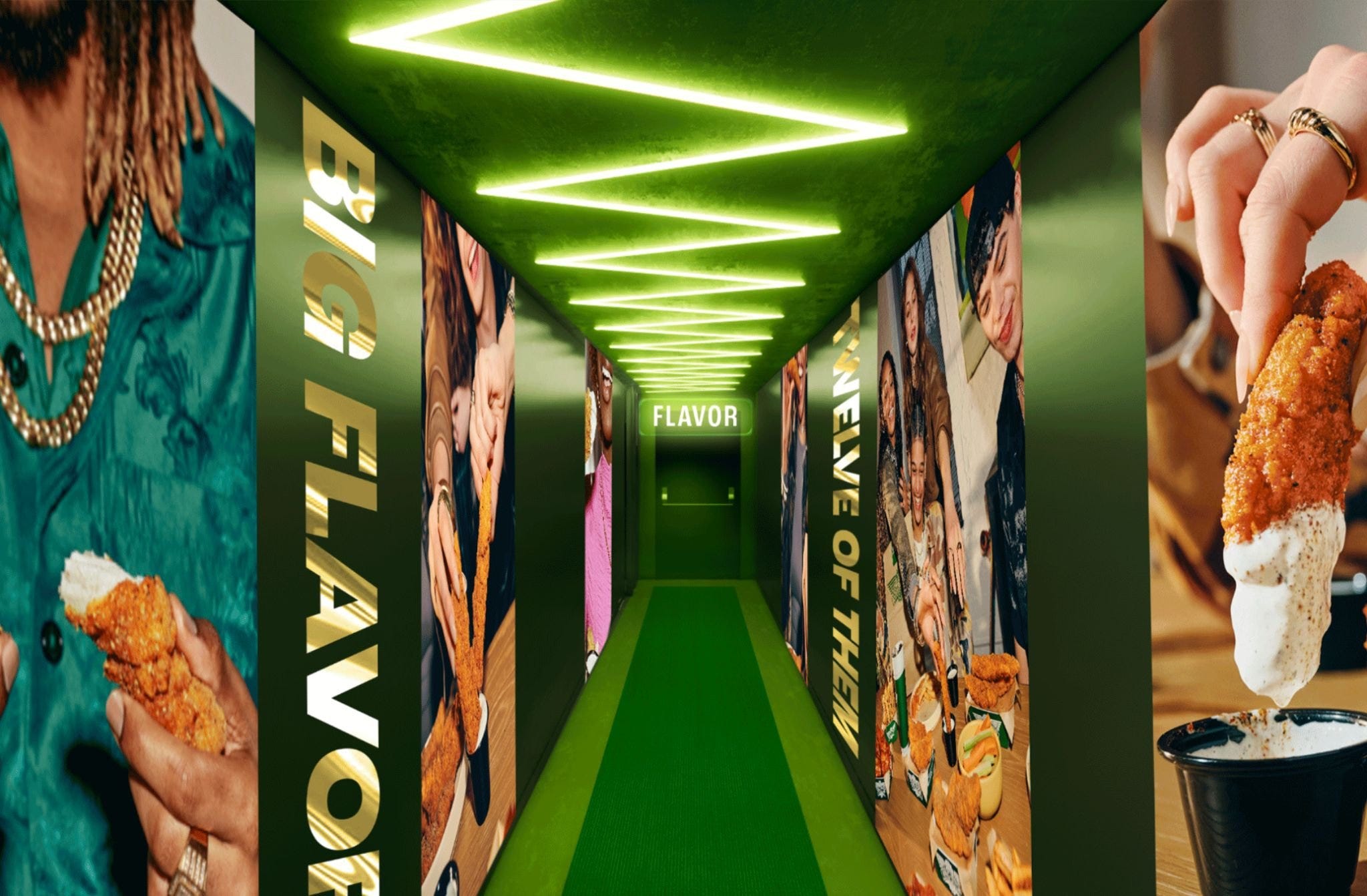 그런데 윙을 어떻게 여러 가지 맛을 섞는 믹솔로지의 관점에서 접근했다는 것일까요? 이번에도 치킨이 아니라 치킨의 조연이자, 윙스탑의 킥인 12가지 시그니처 맛에서 출발했어요. 팝업을 방문한 고객들이 원하는 소스에 뉴 크리스피 텐더를 맛볼 수 있도록 한 거예요. 고객이 맛을 고르면 스탭들이 즉석으로 치킨 텐더에 그 소스를 입혀 서빙했죠. 고객들은 하나의 맛을 맛볼 때마다 ‘플레이버 플라이트 카드(Flavor flight card)’에 스티커를 받았고, 12개 스티커를 모두 모은 고객들은 ‘명예의 전당’에 이름을 올렸죠.