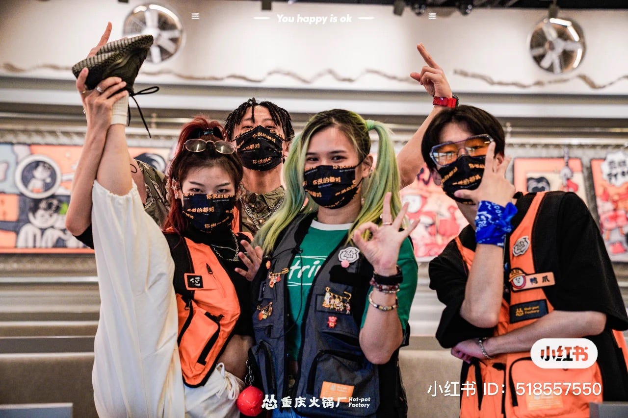 춤을 추는 직원들을 하나하나 살펴보면, 다들 알록달록한 컬러로 염색한 머리부터 시작해 각종 액세서리 등, 마치 아이돌 스타일링을 연상할 정도로 각자 개성들을 강하게 드러내요. 쏭충칭훠궈 직원을 뽑는 기준에 아이돌 연습생 우대가 있는 게 아니냐는 농담이 나돌 정도죠.