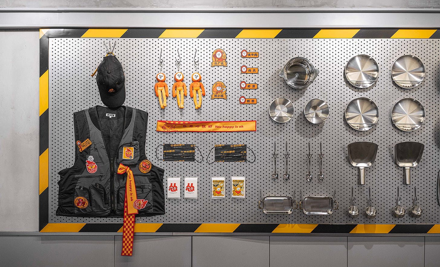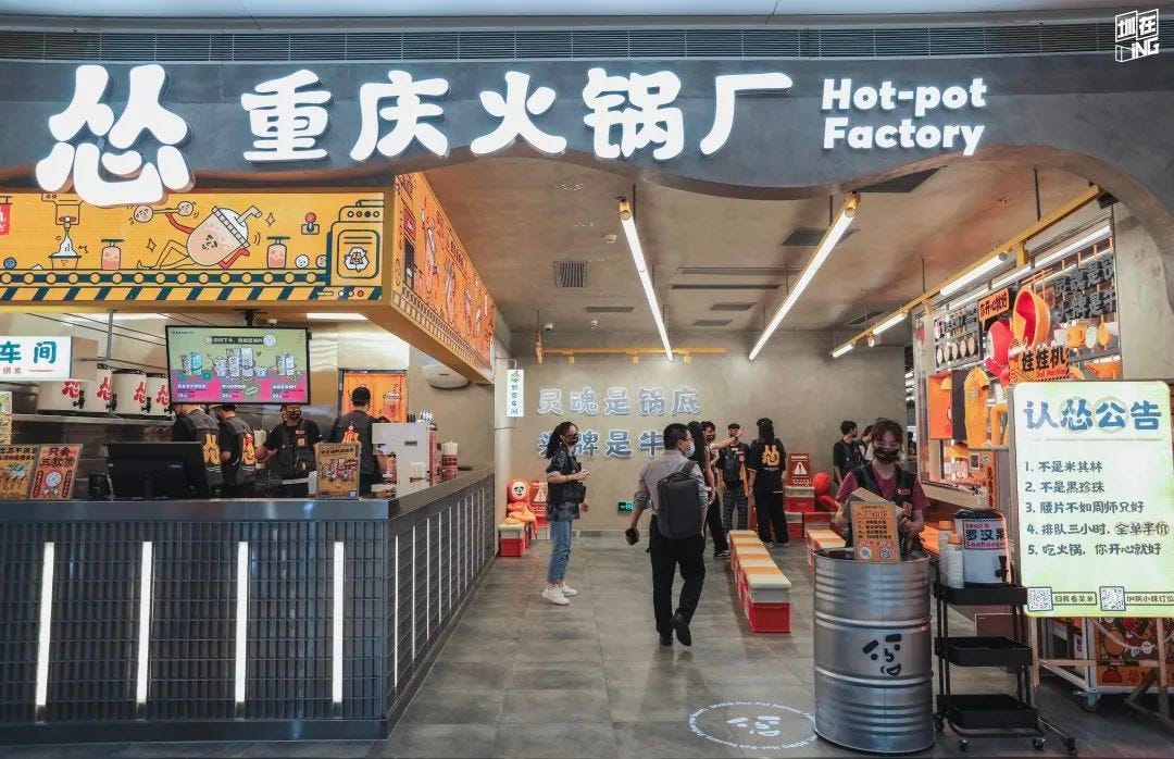 이 두 브랜드를 만든 건 지우마오지우 그룹이에요. 먼저 중국의 민물 생선요리 레스토랑인 ‘타이얼쑤안차이위’를 성공적으로 프랜차이즈화하면서 유명해졌어요. 1) B급 감성의 네이밍과 브랜딩 2) 단일 품목의 훌륭한 음식 퀄리티 3) 남다른 서비스로 차별화를 꾀했는데요. 이 성공 방정식을 그대로 적용해 2020년에 오픈한 훠궈 프랜차이즈가 쏭충칭훠궈창이에요. 직역하면 ‘루저 충칭훠궈 공장’이죠. 참고로 앞서 설명한 타이얼쑤안차이위를 직역하면 ‘멍청한 쑤안차이위’이고요.
