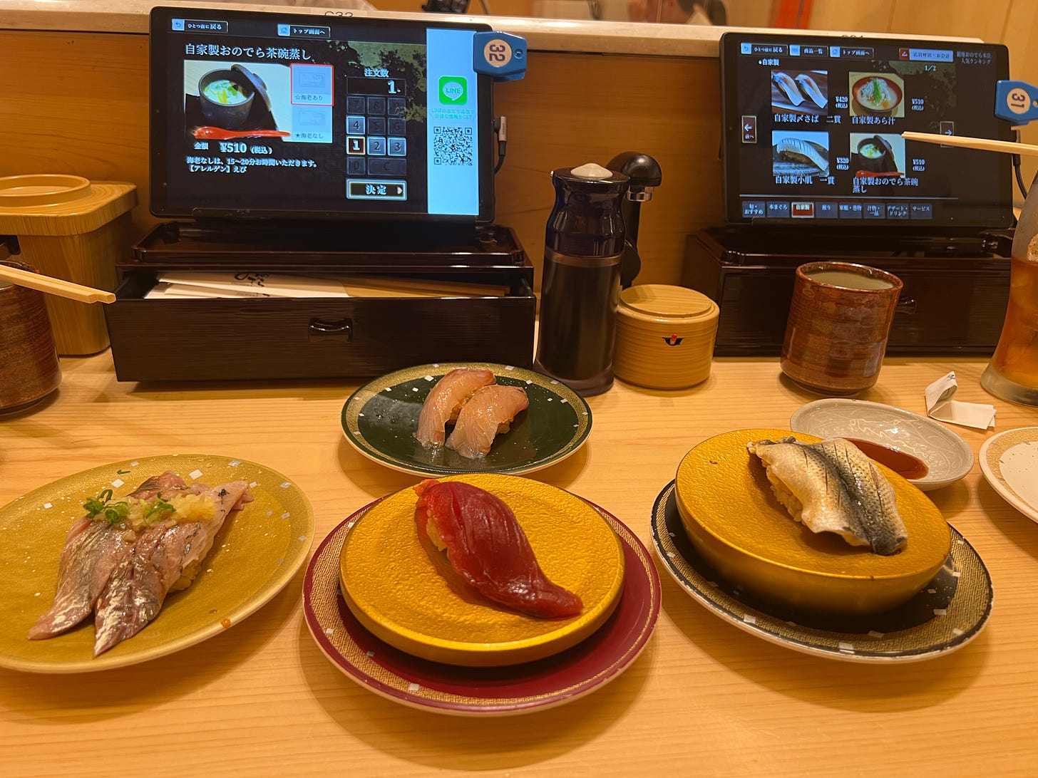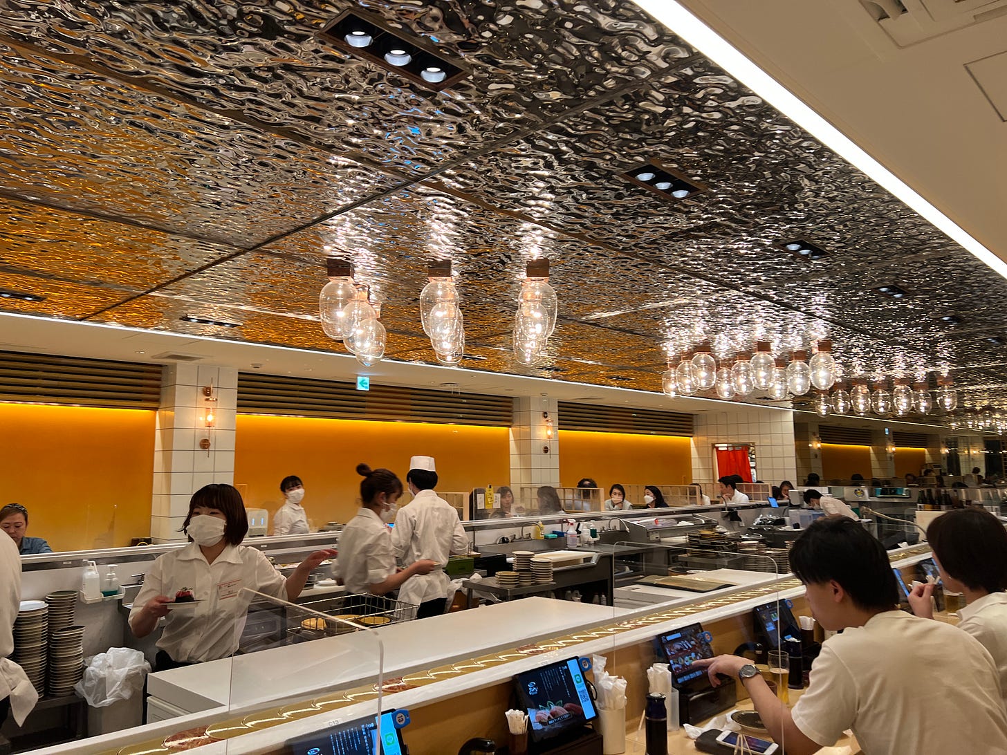 그런데 동일한 참치를 620엔~900엔(6,000원~8,500원) 사이에 먹을 수 있는 곳이 있어요. 바로 ‘회전 스시 긴자 오노데라’에서죠. 이름에는 긴자가 들어가 있지만 오노데라가 2021년 10월에 선보인 오모테산도에 위치한 회전 초밥집이에요. 이곳에선 일본 최고의 품질을 자랑하는 생선을 사용해 만든 초밥 10개 접시를 5천엔(약 4만 8천원) 정도에 먹을 수 있어요. 저가의 회전 초밥집에 비하면 살짝 높은 가격이지만 퀄리티에서 큰 차이가 나요.