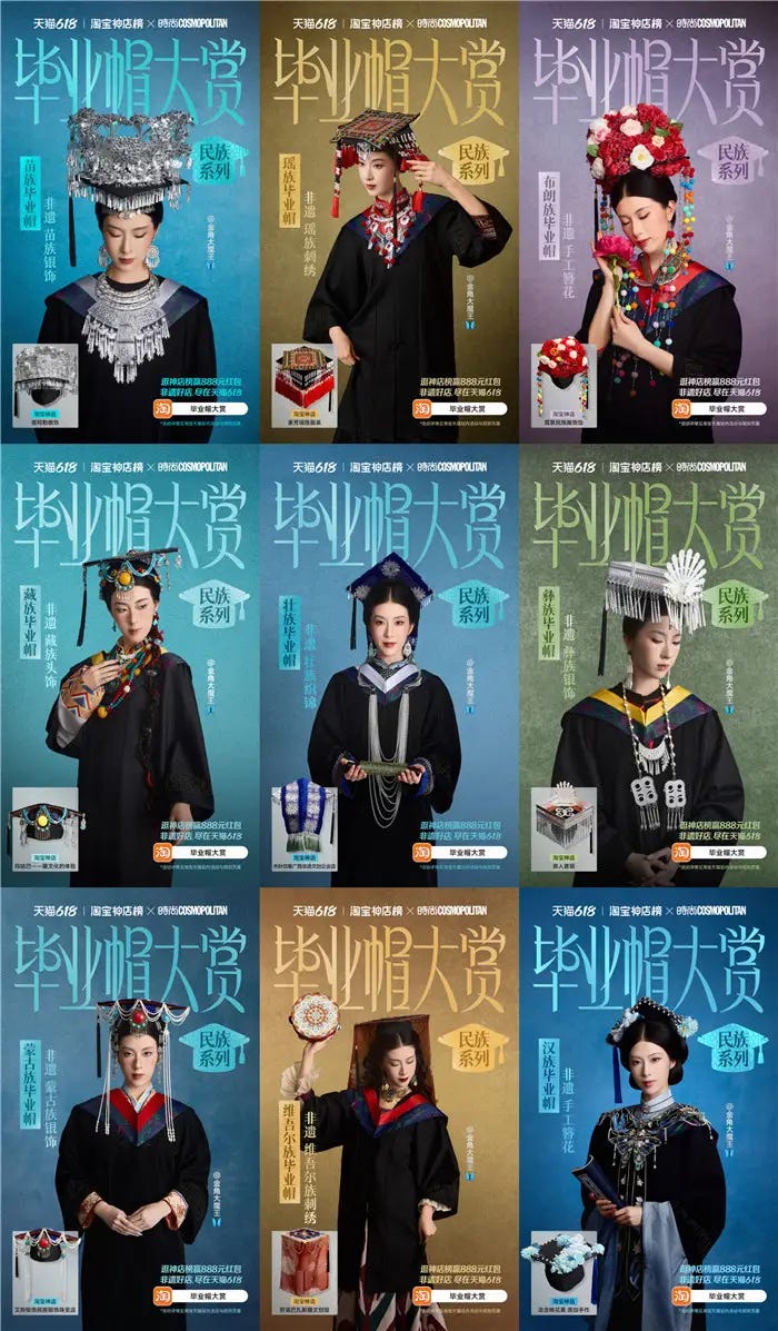 티몰(Tmall)은 2025년 졸업 시즌을 맞아 특별한 ‘졸업 모자 페스티벌’을 기획했어요. 타오바오 인기 스토어와 패션 매거진 코스모폴리탄, 인플루언서와 협업해 중국 무형문화재를 담은 학사모 디자인을 선보인 거죠. 은세공, 자수, 비단 등 총 아홉 가지 중국 소수민족의 전통이 학사모에 녹아들었어요. 영상 속에서 이 특별한 학사모를 쓴 모습은 단순한 인생 기록 그 이상이었죠.
