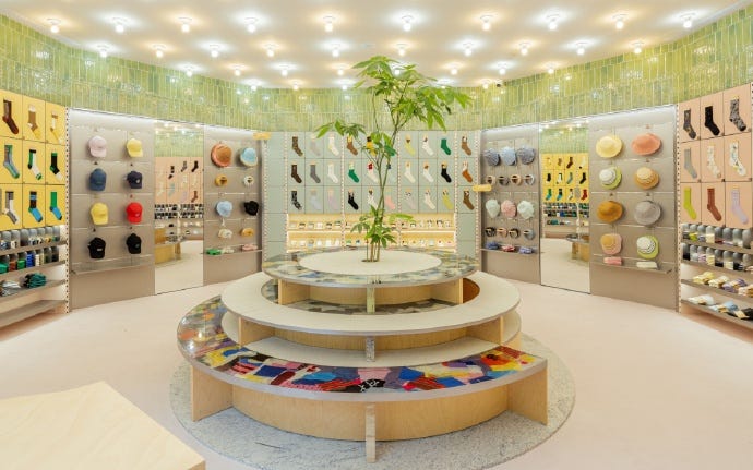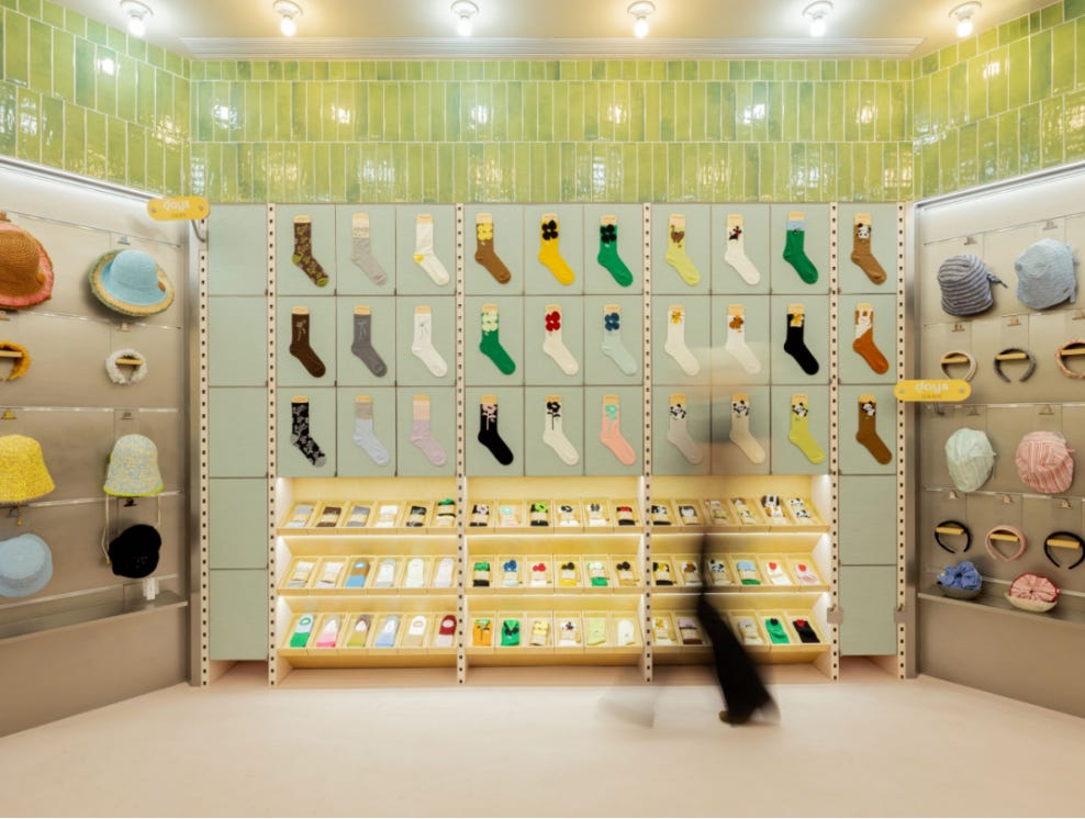 상선파계만의 감각은 공간 디자인으로도 고스란히 이어져요. 상하이에 오픈한 플래그십 스토어 센팝 마트(Sēnpop mart)는 그 자체로 하나의 ‘도파민 실험실’이죠. 입구부터 이어지는 파란 울타리와 유리창, 연핑크와 라임그린으로 채색된 벽면은 시선을 자극하면서도 부담스럽지 않은 조화를 이뤄요. 매장 한가운데에는 다층 구조의 원형 섬이 배치되어 있고, 그 아래에는 지금까지 제작한 모든 양말을 넣어둔 반투명의 조형물이 있어요.