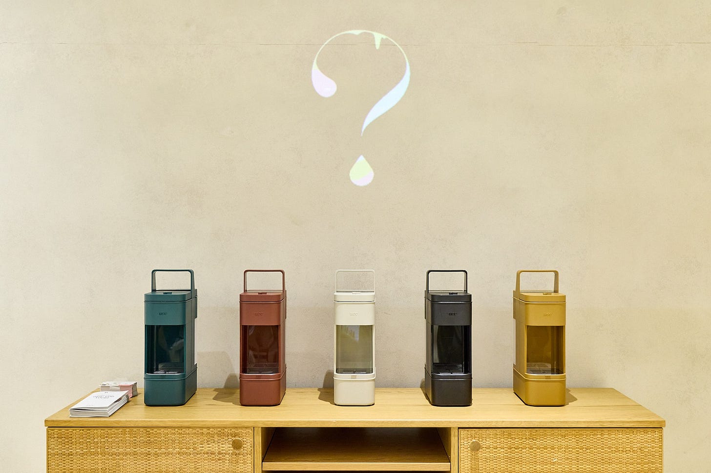 어두운 공간에서 이 조명을 켜면, 물방울이 한 방울씩 떨어지며 빛을 분산시켜요. 천천히 떨어지는 빛을 바라보는 것만으로도 명상하는 효과를 누릴 수 있죠. 듀는 디지털 기기에서 눈을 떼고, 아날로그인 빛의 흔들림이 가지는 치유의 힘을 느껴보라는 취지에서 조명을 새롭게 디자인했어요.