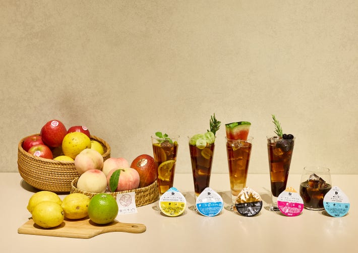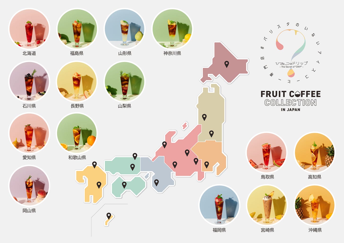 히미츠노드립은 이번 팝업을 위해 드립 팟으로 내린 커피에 일본 각지의 과일을 섞어 만든 15종의 과일 커피 메뉴를 개발했어요. 이때 모든 과일 커피에 같은 커피를 사용한 게 아니라, 각 과일마다 어울리는 드립 팟을 매칭했어요. 맛의 완성도를 높여 드립 팟의 매력을 극대화하기 위함이죠. 예를 들어 후쿠오카 아마오우 딸기와는 ‘블루 마운틴 블렌드’를, 오키나와 파인애플 및 망고와는 ‘하와이 코나 블렌드’를 섞는 식이에요.