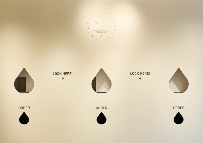 카페의 이름은 ‘히미츠노드립(ひみつのドリップ)’. ‘비밀의 드립’이라는 뜻이에요. 아이스 커피 전문점인데, ‘비밀스럽게’ 커피를 팔아요. 고객이 커피 메뉴를 선택하고 계산하면, 번호가 적힌 토큰을 주는데요. 이 토큰을 흰색 벽면에 ‘주문(Order)’이라고 쓰여 있는 작은 물방울 모양 창구에 떨어뜨려요. 그럼 바로 위 더 큰 물방울 모양 창구로 주문한 커피를 내어주는 식이에요. 고객은 공식적으로는 커피를 만드는 과정을 볼 수가 없죠.