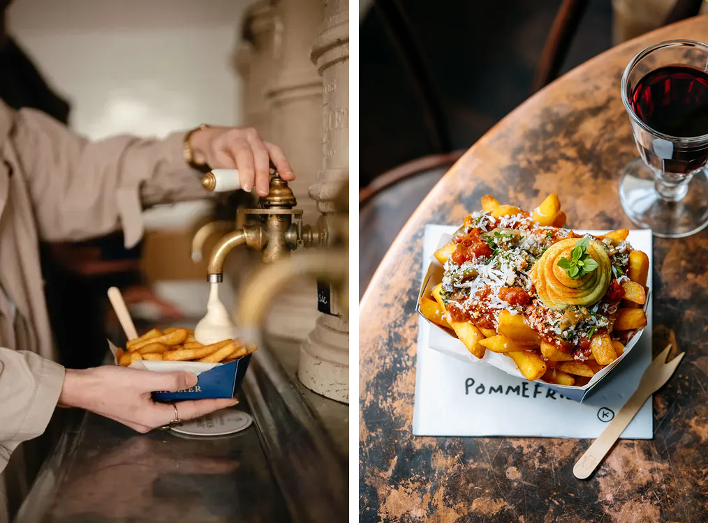 게다가 감자튀김의 토핑은 정기적으로 업데이트 되는데요. 이때 신메뉴 출시 방식이 럭셔리 패션 업계를 연상하게 만들어요. ‘SS25 콜렉션’, ‘FW25 콜렉션’ 등의 이름 하에 새로운 메뉴들이 공개되거든요. 여기에 함께 마실 수 있는 음료로는 맥주뿐만 아니라 칵테일이나 와인 등 고급 주류를 페어링하고요. 간단히 마실 수 있는 테이블 와인이나 마티니, 마가리타 등은 물론이고 고급 와인 중 하나인 슈퍼투스칸에 속하는 ‘티냐넬로(Tignanello)’, 샴페인 ‘뵈브 클리코(Veuve Cliquot)’ 등을 판매하죠. 이런 와인들을 취급하는 감자튀김 가게는 프리츠 아틀리에가 세계적으로 유일하지 않을까요?