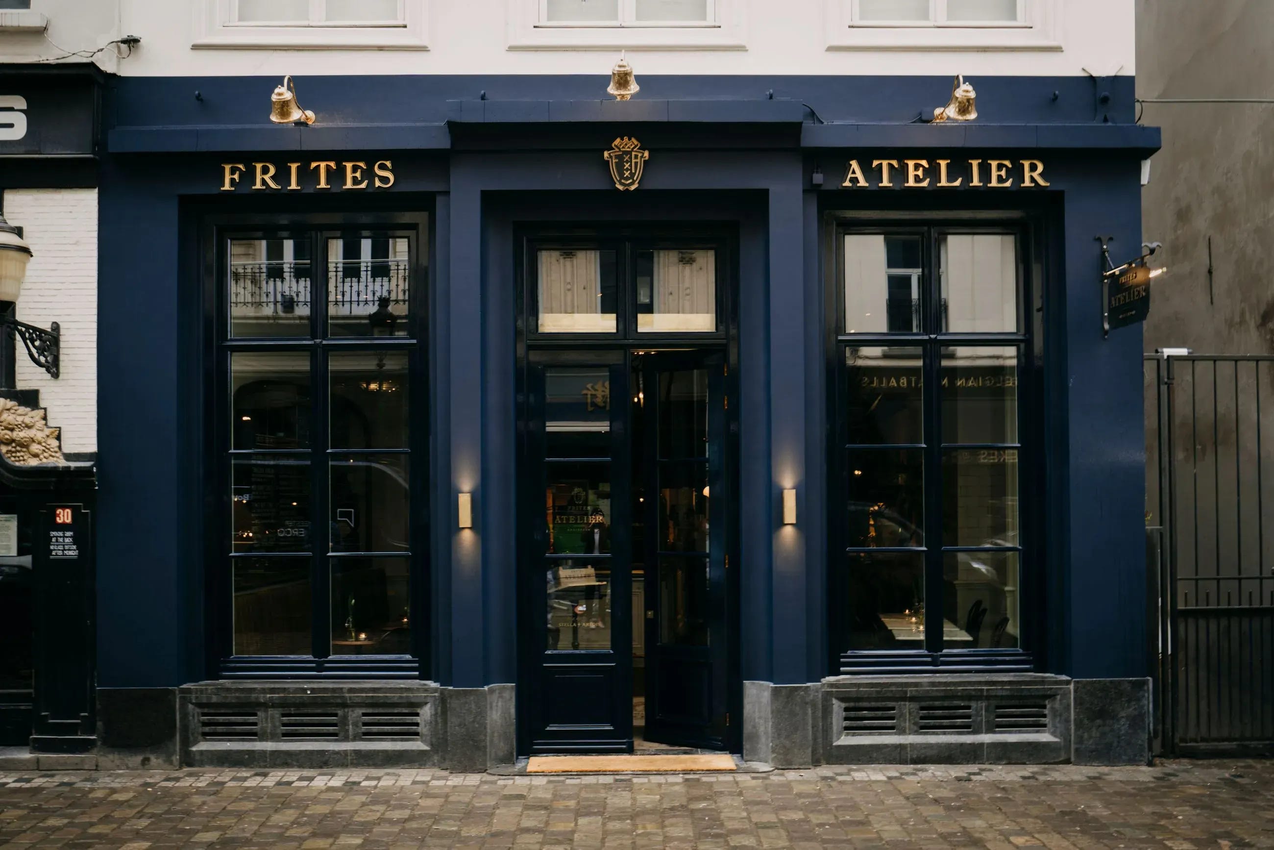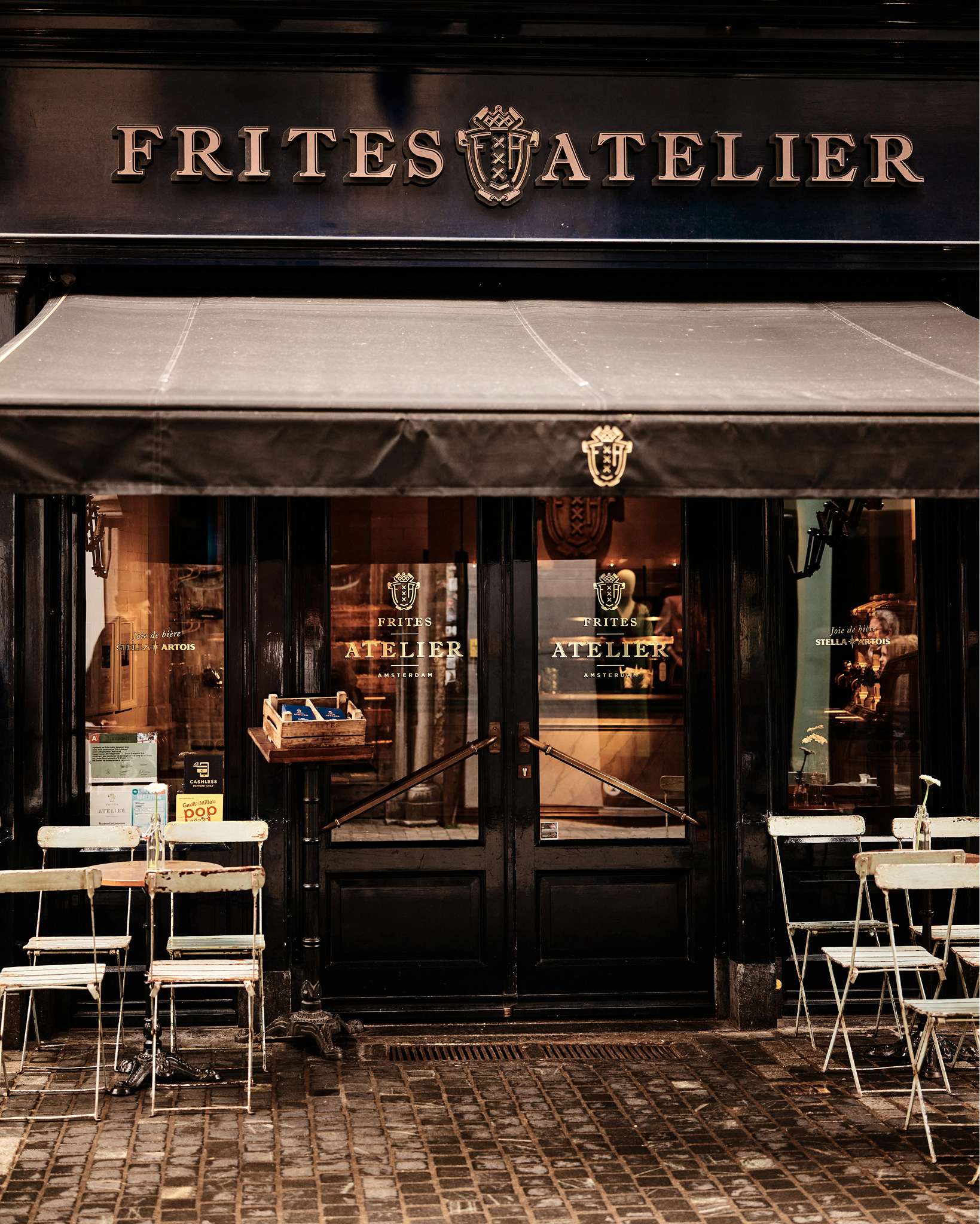 럭셔리한 감자튀김과 음료를 즐길 수 있는 매장인만큼, 공간 또한 흔히 볼 수 있는 감자튀김 가게와는 거리가 멀어요. 마치 프랑스의 브라세리를 연상케 하는 고풍스러우면서 세련된 외관에 타일 바닥, 청동 디테일, 세라믹 소재 등을 적절히 사용해 고급스러운 분위기를 연출했어요. 공간 분위기에서도 프리츠 아틀리에가 럭셔리 브랜드를 지향하고 있다는 것을 알 수 있죠.