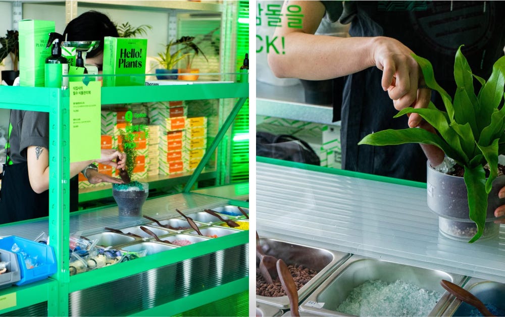 특히 각종 팝업 스토어에서의 행보는 매번 화제를 끌어 모았어요. 마치 샌드위치 가게에서 재료를 직접 조합하듯 화분과 식물, 행잉 스트랩 등을 골라 완성할 수 있는 ‘플랜트 서브웨이 바(Plants subway bar)’, 식물이 전하는 메시지를 직접 귀로 들어볼 수 있는 ‘플랜트 사운드(Plants sound)’ 등은 식물과 더 잘 교감할 수 있도록 도와주죠. 이는 브랜드 세계관에 더 잘 몰입할 수 있는 계기가 되고요.