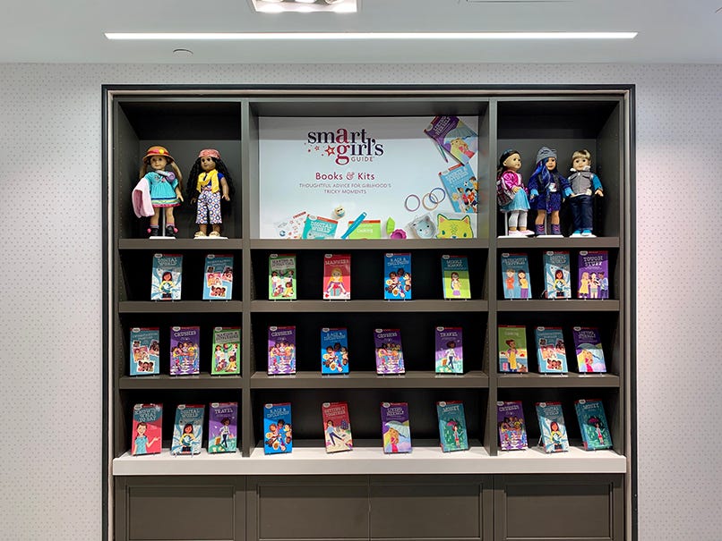 아메리칸 걸 플레이스를 차별화시키는 포인트는 또 있어요. 인형 가게인데 곳곳에 책을 진열해 놓았죠. 생뚱맞아 보일 수 있지만 책은 아메리칸 걸에서 중요한 역할을 해요. 인형을 인형이 아니라 캐릭터로 만들어 주거든요. 아메리칸 걸에서 판매하는 인형 중, 커스텀 인형인 ‘트룰리 미’를 제외한 모든 인형들은 자신만의 이야기를 가지고 있어요. 단순히 인형에다가 이름, 나이, 인종, 취미 등 페르소나만 부여한 게 아니에요. 책에서 각 캐릭터를 중심으로 한 스토리와 세계관이 펼쳐지죠. 각 인형은 이 스토리와 세계관 속에서 고유한 인형으로 거듭나고 성장하는 거예요.