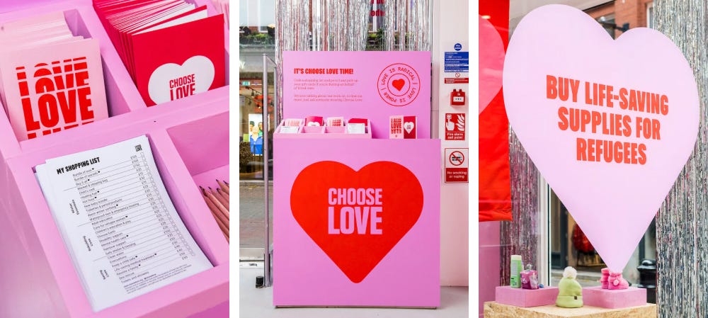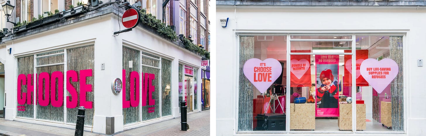 겨울의 런던 리젠트 스트리트는 연말 분위기로 가득해요. 의류부터 장난감까지, 다양한 브랜드들의 홀리데이 캠페인이 거리를 화려한 쇼윈도로 바꿔놓죠. 반짝이는 조명과 캐롤이 이어지는 매장 중에 눈길을 끄는 특이한 쇼핑 공간이 있어요. 이곳의 이름은 ‘사랑을 선택하세요(Choose Love)’. 언뜻 보면 겨울시즌 용품을 파는 매장처럼 보이지만, 전혀 달라요. 여기는 물건을 사고도 가져갈 수 없는 상점이거든요. 무슨 말이냐고요?