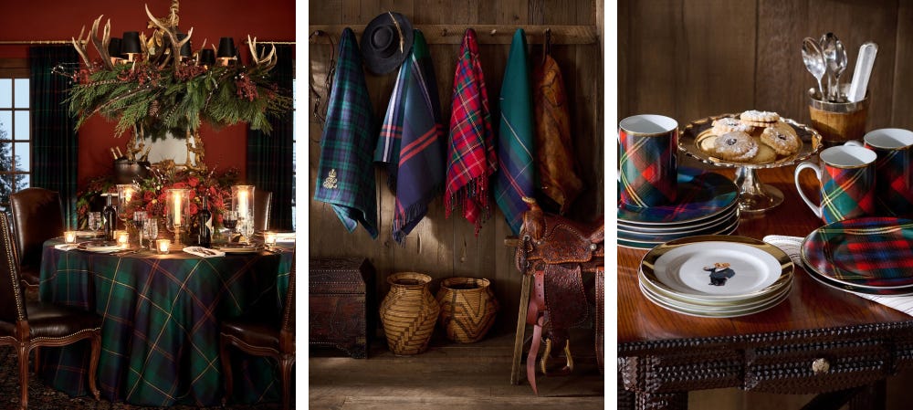 랄프 로렌 크리스마스는 패션 브랜드 랄프 로렌이 오랫동안 보여준 겨울 감성을 공간으로 옮겨 놓은 인테리어예요. 우드톤의 가구, 초록색과 버건디색이 섞인 타탄 체크, 벨벳 장식처럼, 클래식한 미국 동부의 겨울 집을 연상시키는 분위기가 핵심이에요. 화려하거나 과장되기보단, 시간이 오래 흐른 듯한 따뜻함이 있죠.