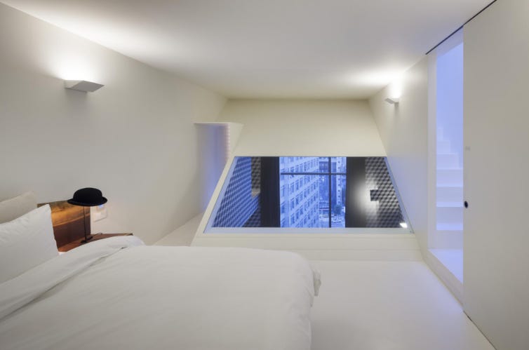 일구구공은 클라이언트로부터 “경험해보지 못한 부티크 호텔”을 의뢰 받았어요. 당시, 부티크 호텔은 모텔과 다를 바 없는 시설로 여겨졌죠. 그래서 일구구공은 공간에 시각적인 컨셉을 만들어 개성을 덧입히기로 했어요. 소설호텔에는 12개의 룸타입이 있는데요. 각각의 방을 독특하게 꾸몄어요. 가령, 어떤 방은 직사각형 큐브가 방을 대각선으로 가로지르고, 어떤 방은 거울을 통해 거울 속 공간과 현실의 공간 사이의 괴리를 자아내는 식이에요.
