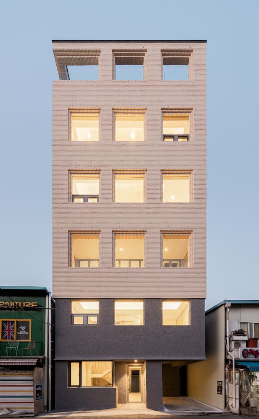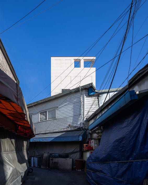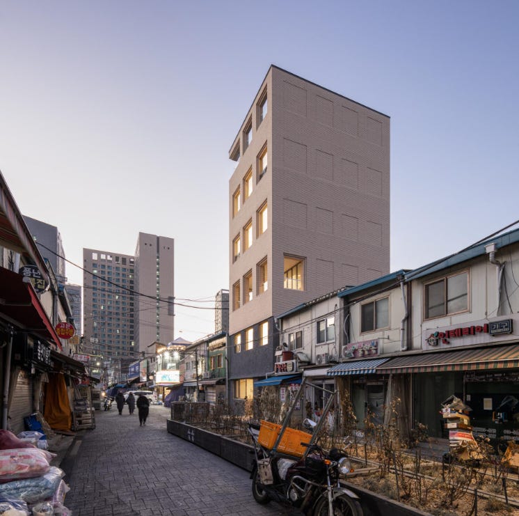 이러한 고민과 경험의 과정에서 동네의 유형화를 실현시킨 결과물이 2023년 완공된 황학동의 옥수수집입니다. 들안예술마을 창작소와 함께 iF 디자인 어워드 2024 본상을 수상한 건물이죠. 시장 거리 속, 옥수수 알갱이처럼 빽빽하게 수놓아져 있는 건물들 중 알갱이(건물) 몇 개를 빼고 새로 지은 건물이라서 이름이 옥수수집이에요.