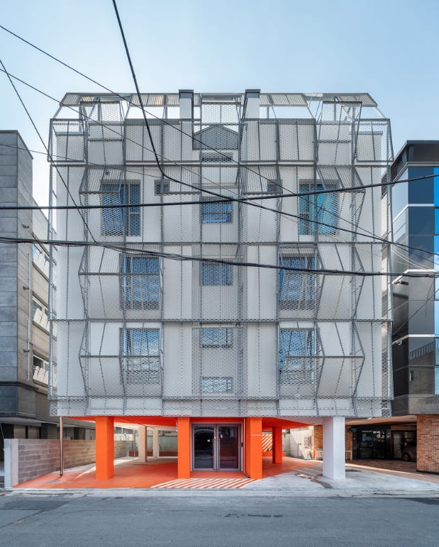 원래 들안예술마을 창작소 건물은 원룸 빌라였어요. 빌라를 개축해 지었죠. 그래서 언뜻 보면 주변의 빌라들과 큰 차이가 없어요. 다만, 주황색으로 칠한 1층 필로티 공간, 건물 전면을 감싸고 있는 알루미늄 메시 등으로 존재감을 뽐내죠.