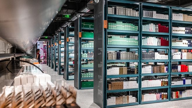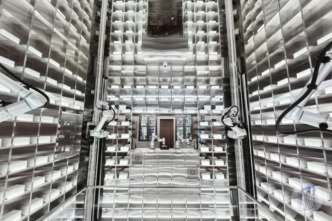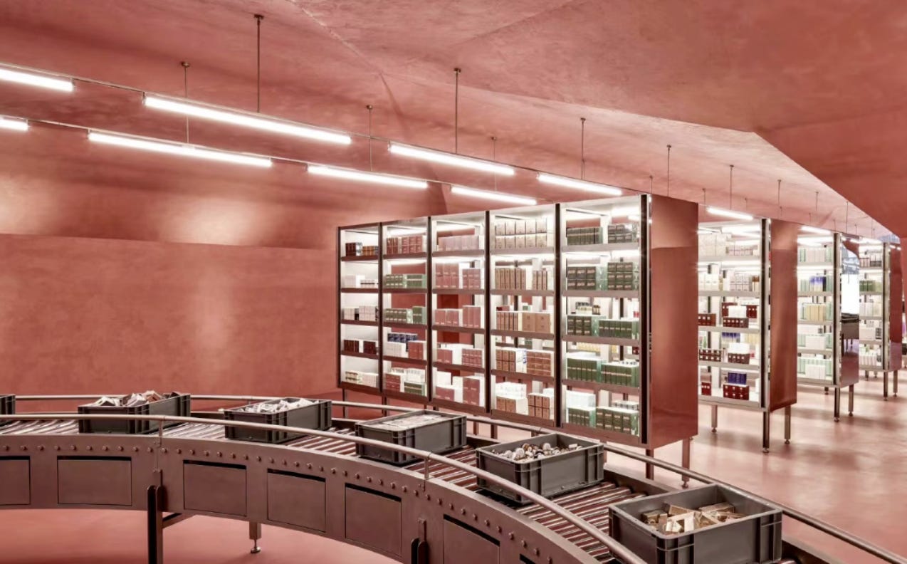 뒤편으론 크리스탈 수납장으로 사방을 높이 쌓아 올린 공간이 건물을 수직으로 관통하는데 마치 은행 속 개인 금고를 연상케 해요. 칸마다 화장품 재고가 놓여 있어, 로봇팔들이 상하로 움직이며 이를 꺼내 ‘랜덤 박스’를 포장하는 장면을 볼 수 있어요. 이 랜덤 박스는 하메이 우한 지점에서만 판매하는 단독 상품이고요.