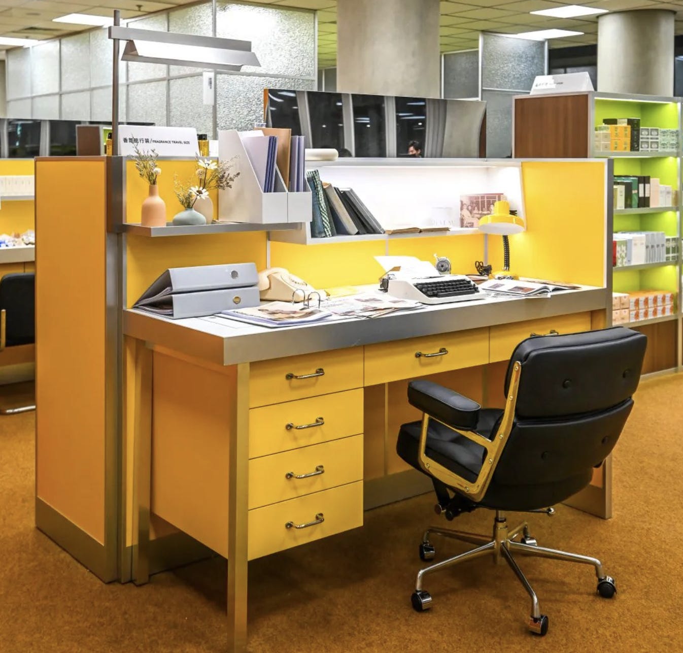 상하이에서 약 2시간 거리에 위치한 항저우 지점은 ‘70, 80년대 사무실’을 컨셉으로 했어요. 컬러풀한 데스크와 책장 등을 화장품 진열대로 삼았죠. 책상의 약 70% 정도는 화장품 진열대로, 나머지 30% 정도는 실제 사무실에서 쓸 법한 사무용품과 인테리어 소품을 비치해 자유로이 사진 촬영할 수 있는 포토존처럼 만들었어요. 회의실에선 헤어나 각종 뷰티 가전을 체험할 수 있도록 했어요.