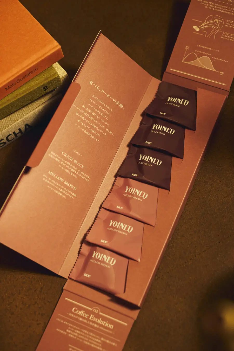 또한 커피를 고체로 디자인하자 커피를 소비하는 재미는 물론이고, 커피의 용도가 확장되고 새로운 카테고리를 개척하는 결과로 이어졌어요. 커피를 술의 ‘안주’로 즐길 수 있게 된 건데요. 진한 커피 콩의 풍미를 느낄 수 있는 크레이지 블랙은 숙성도가 높은 다크 럼, 향신료가 들어간 쇼추, 오렌지 리큐어, 브랜디, 매실주 등과 잘 어울려요. 부드러운 단맛이 있는 멜로우 브라운은 사케, 과일 리큐어, 데킬라, 포트 와인 등과 마리아주가 좋죠.