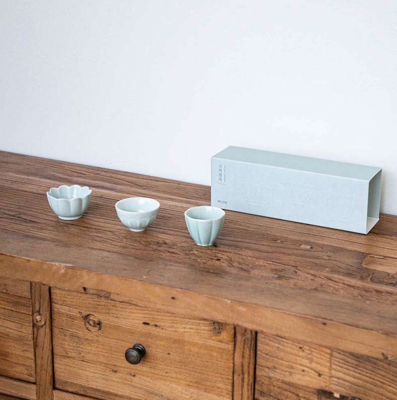 그런 국립중앙박물관이 2023년 말에 내놓은 또 다른 히트 상품이 있어요. 이번엔 ‘청자 잔세트’예요. 고려청자를 본뜬 술잔이 각기 다른 모습으로 세 종류 들어가 있는 세트죠. 각각 고려 12세기 때 제작된 ‘청자 꽃모양 사발’, ‘청자 참외 모양 병’, 고려 11세기 때 만들어진 ‘청자 음각 연꽃잎무늬 대접’을 본떠서 만든 술잔이에요.