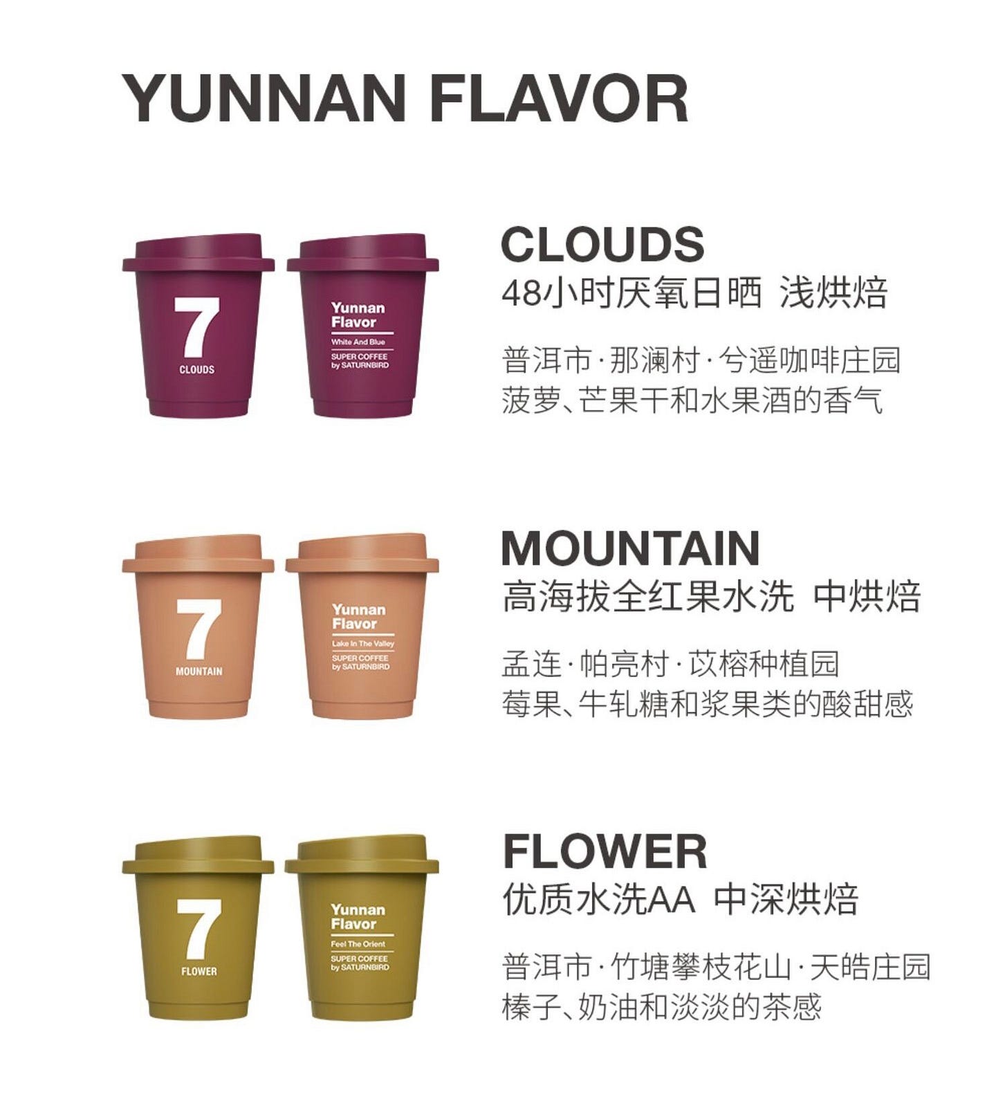 7호는 산뚠반이 직접 기획한 한정판 커피와 음료 라인이에요. 산뚠반은 커피 이외에도 디카페인 커피, 보이차 등 커피 대체 음료 등을 출시하기도 하는데요, 이를 7번을 추가해 선보였어요. 7호의 대표적 사례는 최근 커피 시장의 강자로 꼽히는 중국 운남 커피 시리즈에요. 운남의 꽃, 산, 구름을 메인 테마로 하죠. 꽃 시리즈는 꽃내음의 아로마 향이 가득한 커피를, 산 시리즈는 중국 고지대에서 자란 산사나무 열매를 미디엄 로스팅으로 선보였죠. 구름 시리즈는 48시간 동안 운남의 강한 햇빛에 말린 커피콩을 라이트 로스팅한 커피에요. 여기에다가 ‘루허(鹿菏)’, ‘BX-플래닛(BX-Planet)’, ‘유조우페이고우(宇宙废狗)’ 등 3명의 일러스트 작가들에게 운남의 꽃, 산, 구름을 주제로 한 패키지 디자인을 맡겼죠. 작가가 직접 꽃, 산, 구름 시리즈를 맛보고 얻은 영감을 각자 화폭에 담았고, 작가별 운남 시리즈를 출시해 소장 가치를 더했어요.
