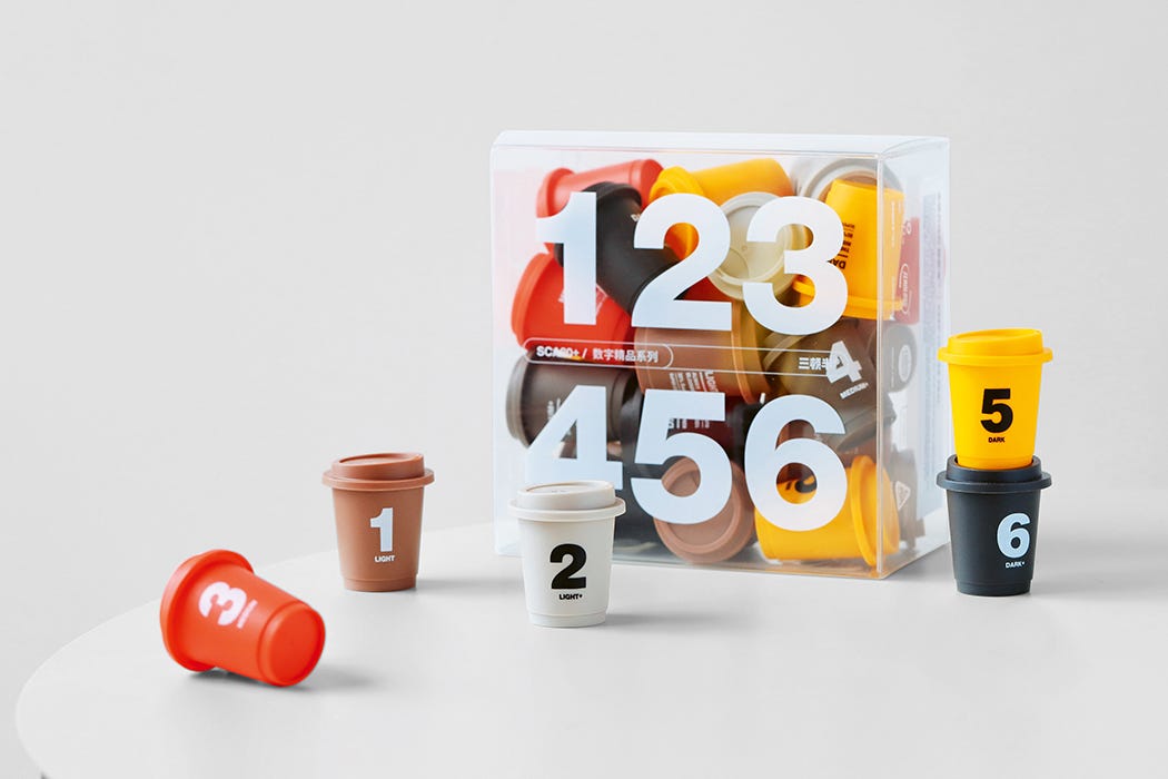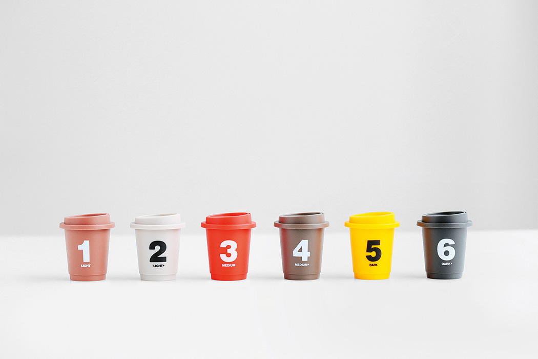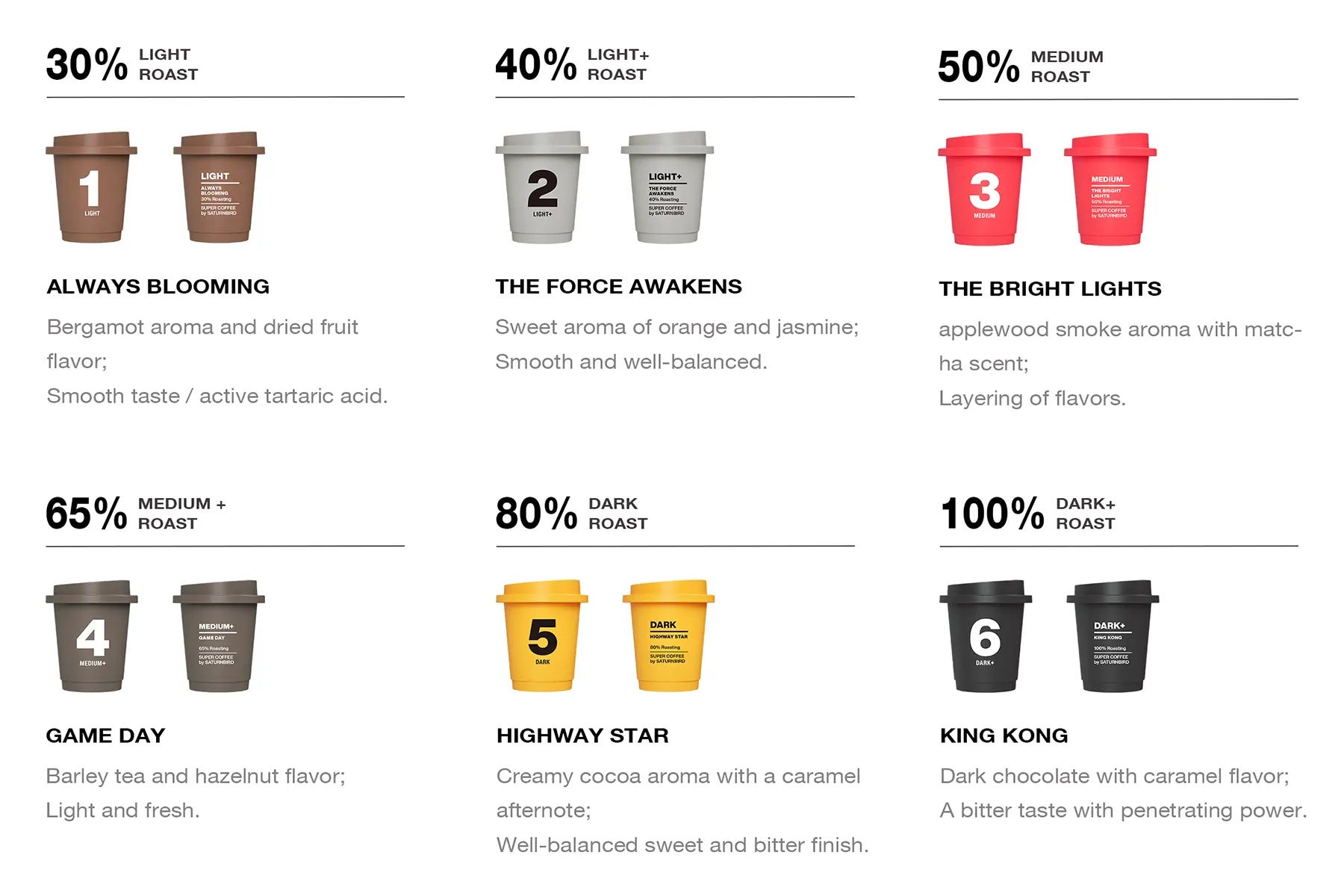 패키지 디자인은 심플하죠. 컬러풀한 테이크아웃 커피컵에 숫자가 1에서부터 6까지 적혀 있어요. 그리고 숫자 아래에 간단하게 숫자가 의미하는 바를 적어 두었죠. 1에는 Light, 2에는 Light +, 3에는 Medium, 4에는 Medium +, 5에는 Dark, 6에는 Dark + 라고요. 어떤 뜻인지 직관적으로 이해가 가죠? 이 숫자는 산미와 로스팅 정도를 나타내며, 1에서 6으로 올라갈 수록 로스팅 강도도 높아지죠.