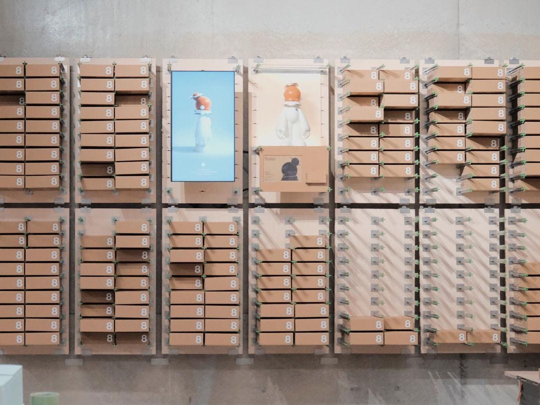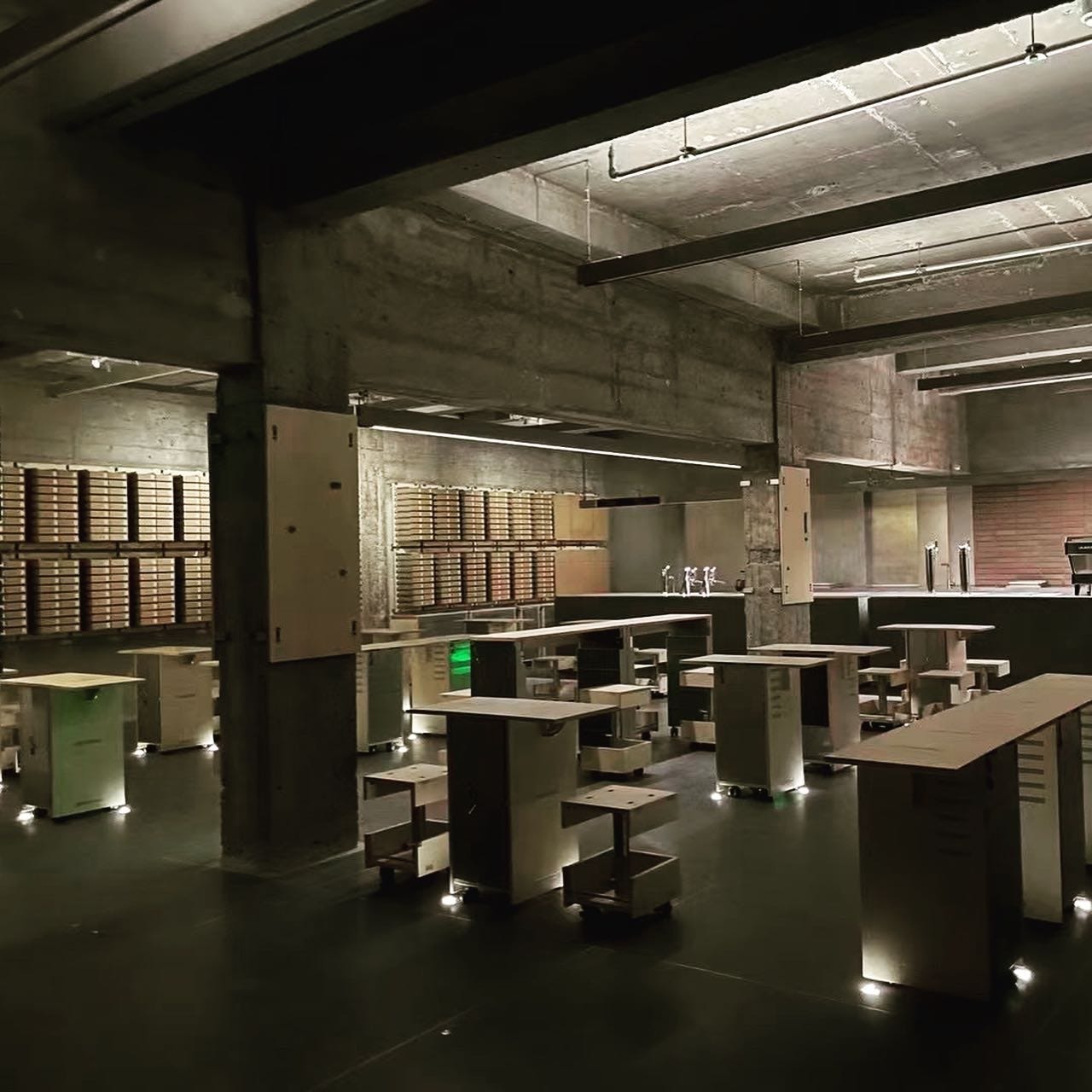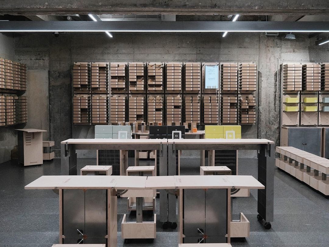 물론 오프라인 매장의 존재의 이유가 8호 한정판 제품에만 있는 건 아니에요. 산뚠반이 오프라인 매장을 연 진짜 의도를 엿보려면 홀 가운데 질서 없이 놓은 의자 겸 테이블을 봐야해요. 나무 판자와 높이를 조절하는 지지대로 구성된 이 의자 겸 테이블은 블록 형태로 되어 있어요. 높이를 조정해 테이블 용도로 사용할 수도 있고, 다른 것과 조합해 긴 테이블이나 1인석으로 만들 수도 있죠.