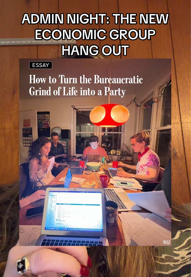 그런데 최근 미국 Z세대가 이 지루한 행정 업무를 파티처럼 즐기고 있어요. 이른바 어드민 나이트(Admin night), 행정 업무의 밤을 통해서요. 혼자라면 스트레스였을 잡무들은 오히려 친구들과 약속을 잡는 유쾌한 명분이 되었고, 번거로운 업무 처리 관련 꿀팁은 대화 소재로 자리잡았죠.