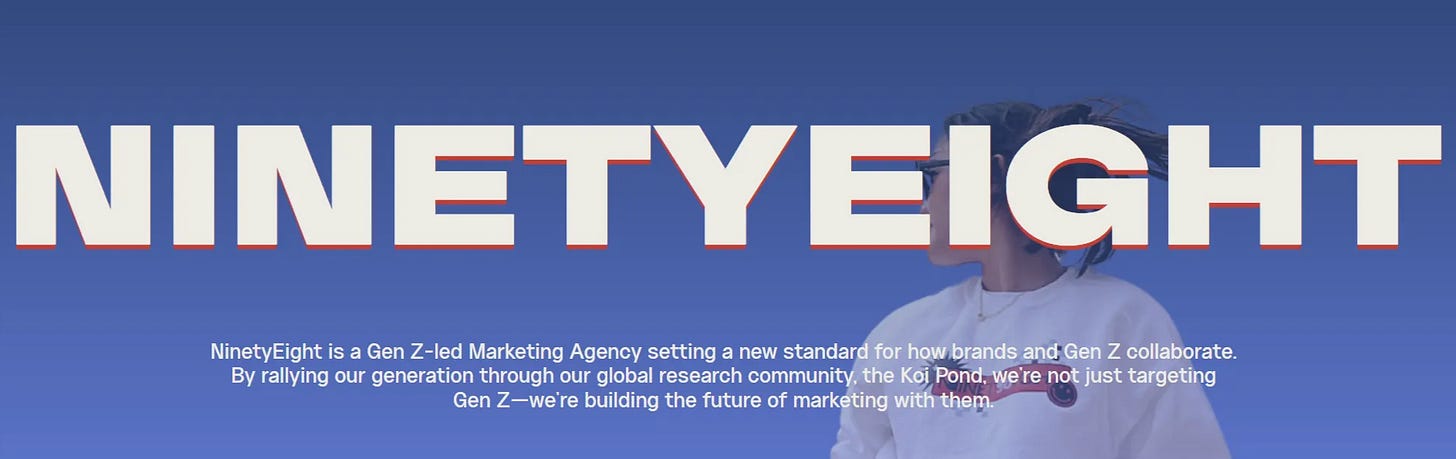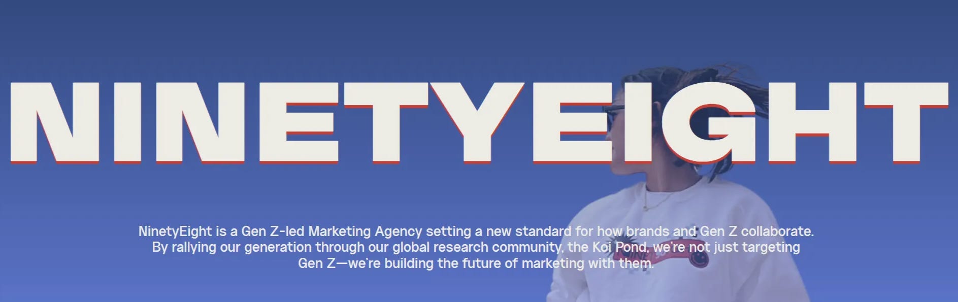 브랜드들은 역사상 가장 복잡하지만, 가장 중요한 세대로 떠오른 Z세대에 대한 인사이트가 필요해요. 이에 최근 에델만 같은 유서 깊은 PR에이전시 뿐만 아니라, 브랜드를 위한 ‘Z세대 번역가’를 자처하는 에이전시들이 생겨나고 있어요. LA 베이스의 Z세대 전문 마케팅 에이전시 ‘나인티에잇(NinetyEight)’이 대표적이에요.