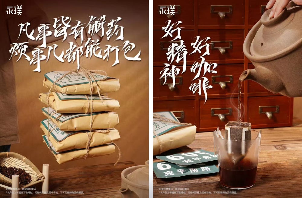 그렇다면 대표적인 사례부터 살펴볼게요. 첫째는 상하이 정신건강센터와 협업해서 출시한 드립백. 융푸는 이 협업에서 커피를 단순한 음료가 아니라, 감정적 처방으로 재해석했어요. 중국 전통 약방 스타일의 드립백 포장에 정신건강센터 주소를 그대로 인쇄해, 마치 커피 한 잔이 정신적 안정과 연결되는 의식인 것처럼 디자인했죠. ‘현대 청년들의 멘탈과 커피의 관계’를 밈처럼 위트 있게 풀어낸 이 협업은, 브랜드가 감정을 다루는 방식의 수준을 한 단계 끌어올린 사례로 꼽혀요.