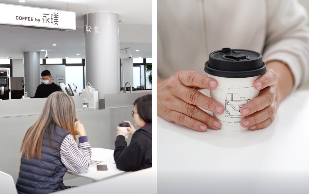이토록 협업에 적극적인 융푸의 태도는, 콜라보를 넘어 완전히 새로운 도전으로도 자연스럽게 이어져요. 가장 최근의 사례는, 상하이 한복판에 문을 연 커뮤니티 카페예요. 이 카페는 젊은 고객들이 붐비는 거리가 아니라, 동네 어르신들이 오가며 들르는 커뮤니티 센터 안에 자리 잡았어요. 화려한 인테리어나 트렌디한 조명 대신, 누구든 편히 앉을 수 있는 낮은 소파와 넉넉한 테이블이 배치돼 있고, 카페보다는 마을 사랑방에 가까운 분위기가 흐르죠.