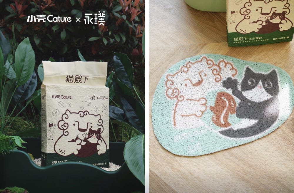 다음 사례는 반려동물 용품 브랜드 샤오커(Cature)와의 콜라보예요. ‘세계 산림의 날’이라는 타이밍에 맞춰, 두 브랜드는 ‘고양이 화장실 장식 경연대회’를 열었어요. 융푸의 커피 찌꺼기를 재활용한 고양이 모래를 선물로 제공하며, ‘친환경, 반려동물, 커피’라는 세 가지 키워드를 동시에 엮은 점이 인상 깊었죠. 융푸는 이전에도 샤오커와 함께 커피 찌꺼기 업사이클링 프로젝트를 선보인 바 있는데요. 브랜드 고유의 소재를 지속 가능성이라는 화두로 연결하면서 차별화된 협업 역량을 보여줬죠.