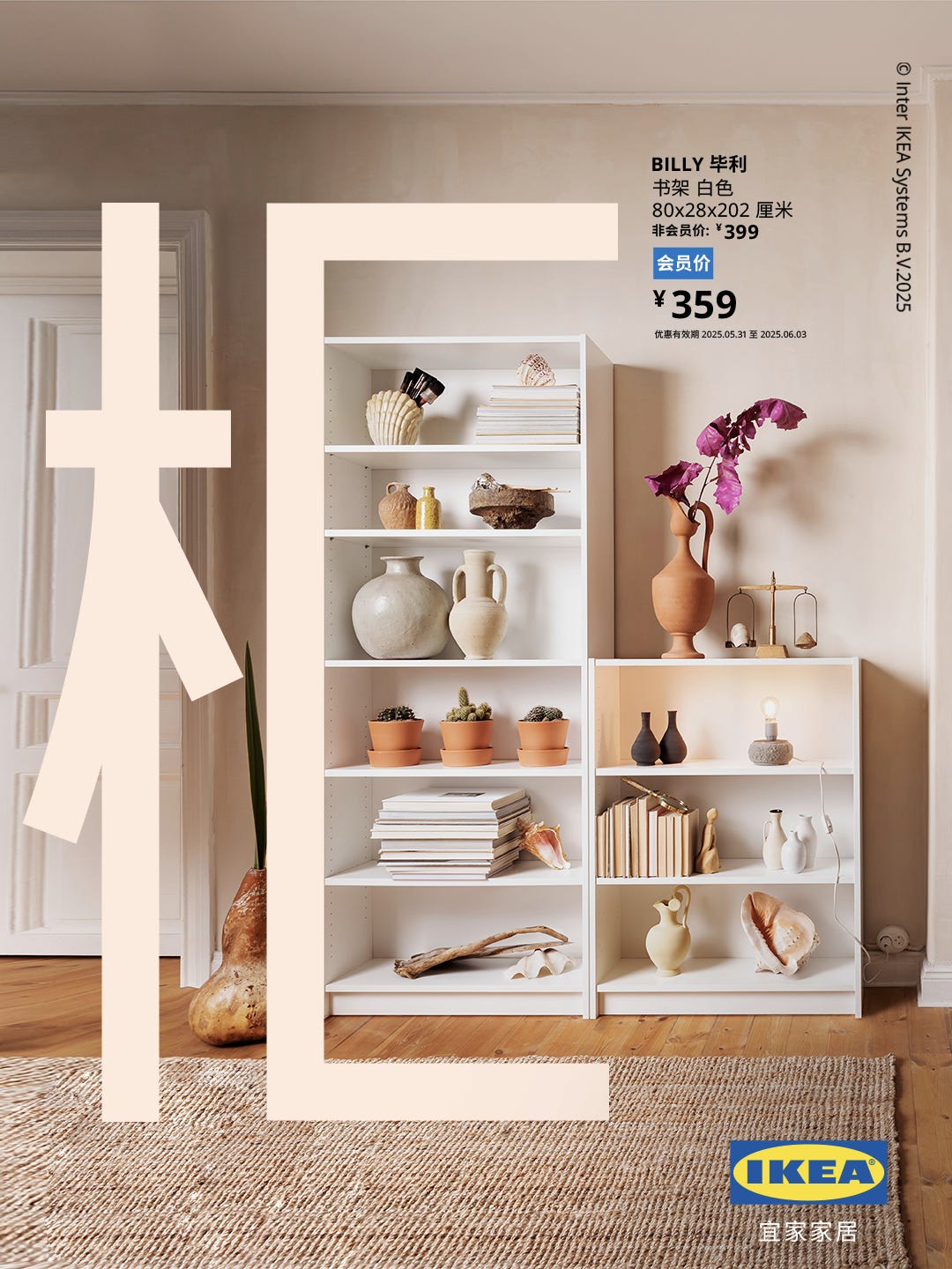 마지막은 전세계에서 5초마다 하나씩 판매되고 있다는 책장 ‘빌리(BILLY)’. 포스터에 쓰인 한자(柜)는 수납장을 뜻하는데, 슬림한 빌리 책장을 절묘하게 배치해서 단어 자체의 의미와 제품을 완벽하게 맞아 떨어지게끔 했어요.
