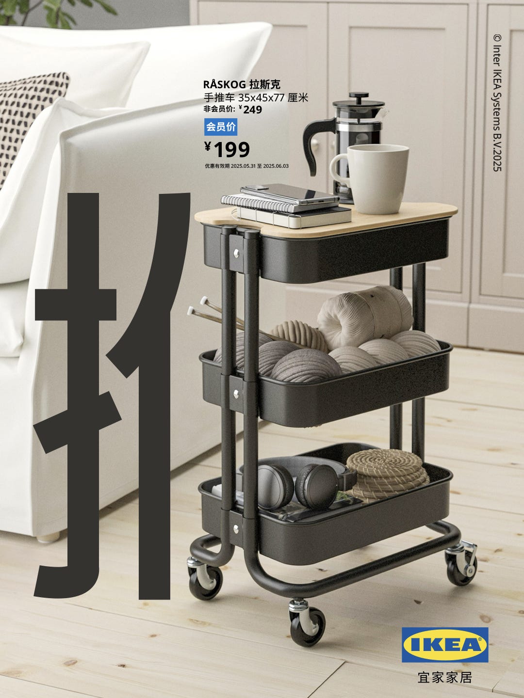 다음으로, 공간 활용도가 좋아 작은 공간에 딱 알맞은 카트인 ‘로스코그(RÅSKOG)’ 제품은 어떻게 소개했을까요? 포스터에 쓰여 있는 한자(推)는 ‘밀다’라는 뜻이에요. 포스터에서는 부수가 들어갈 자리에 실제 카트 이미지를 넣어서 글자와 제품의 의미를 재치 있게 연결했죠.
