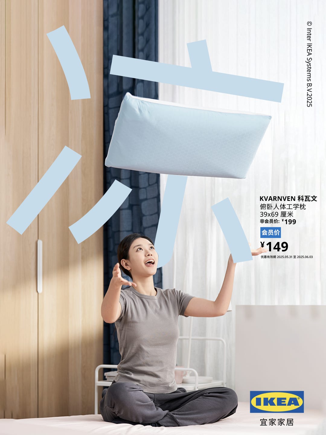 포스터를 한 장씩 살펴 볼게요. 아래 포스터에 소개된 파란색 베개는 이케아의 ‘크바른벤(KVARNVEN)’으로, 한쪽 면에는 온도를 조절하고 시원함을 유지해주는 벌집 모양 패턴이 있어요. 열대야에 시달리기 쉬운 여름에 사용하기 딱이죠. 그 취지를 잘 전달하기 위해 포스터에 ‘시원하다’는 뜻의 한자(凉)를 적었어요. 그리고 파란 베개가 한자의 부수인 ‘口’ 자리에 들어가, 시원한 여름 느낌을 시각적으로 표현했죠.