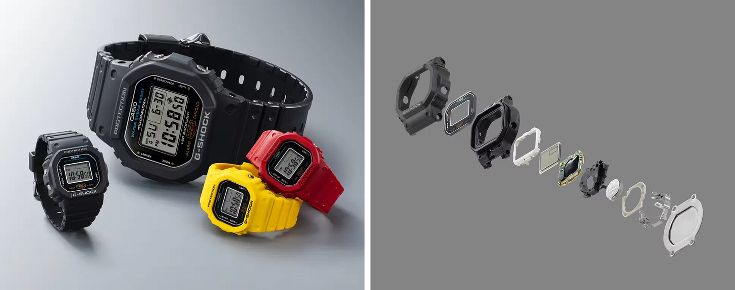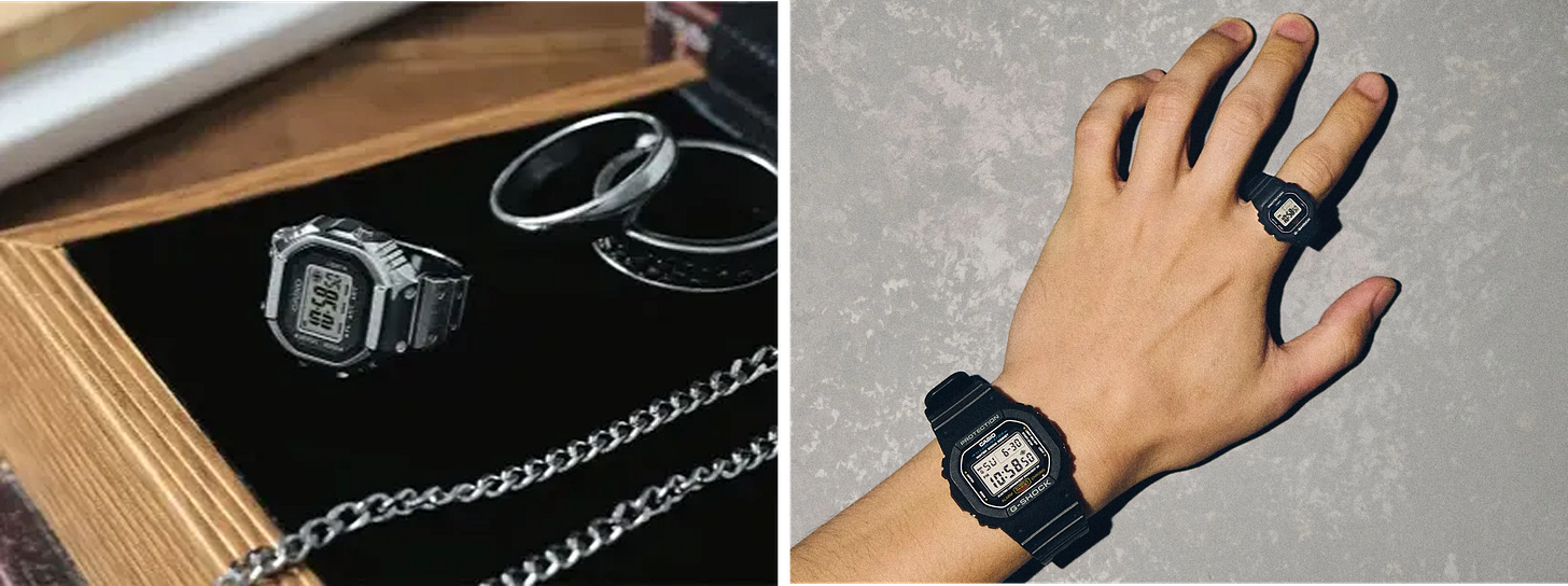 결국 카시오는 기존의 손목시계 고객뿐 아니라, 시계의 바깥에 있는 사람들까지 시계의 세계로 끌어들이는 데 성공했어요. 작지만 존재감 있는 반지 하나가, 시계를 즐기는 방식을 확장해 준 셈이죠. 형태도, 기능도, 철학도 그대로 둔 채 사이즈만 줄였을 뿐인데, 시계는 시간을 알려주는 도구를 넘어 주얼리이자 놀이가 되었어요.