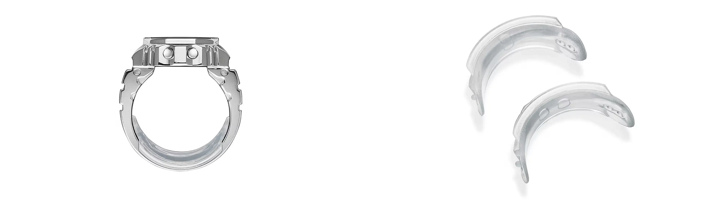 이렇게 링 워치가 뜨거운 인기를 얻자, 카시오는 이 아이디어를 브랜드의 대표 모델인 ‘지샥(G-SHOCK)’에도 적용하기로 했어요. 그리고 2025년 11월, ‘지샥 나노(G-SHOCK nano)’라는 신제품을 선보였죠. 이 모델은 지샥의 상징적인 초기 모델인, 각진 사각형 디자인의 지샥 ‘5600’을 그대로 축소한 반지 사이즈의 시계예요.