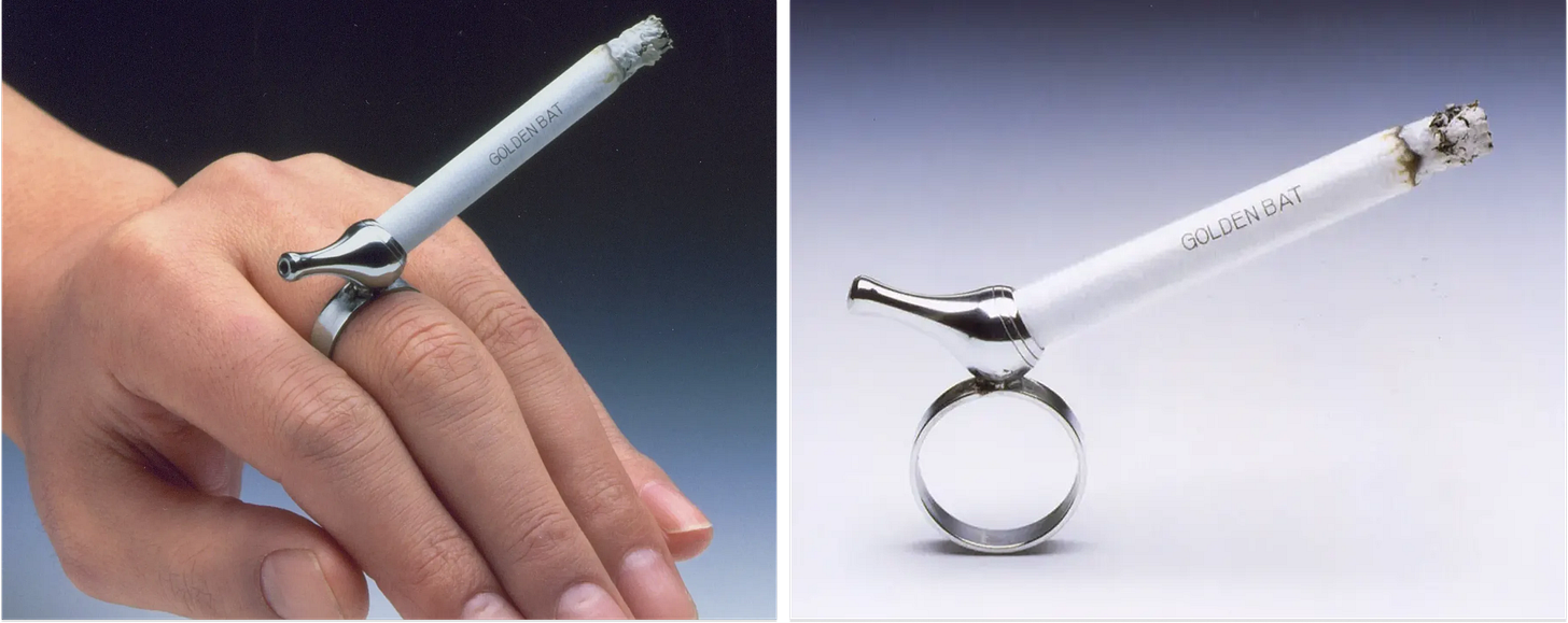 당시 일본은 물자가 부족해서 담배 한 개비도 끝까지 피우는 일이 흔했어요. 그래서 일하면서도 담배를 놓지 않기 위해, 손가락에 끼워 사용하는 반지형 담배 홀더를 만들어낸 거죠. 이렇게 탄생한 반지 파이프는 출시하자마자 주문이 쇄도하며 큰 인기를 끌었고, 여기서 얻은 이익은 훗날 전자 계산기를 개발하는 자금으로 이어졌어요. 그래서 카시오 내부에서는 지금도 이 반지 파이프를 카시오다운 크리에이티브의 시작이라고 보고 있어요.
