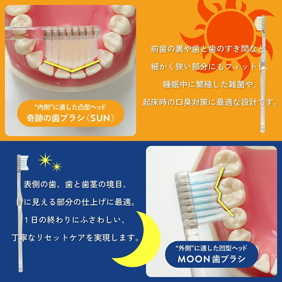 그런데 2025년, 기적의 칫솔이 한 번 더 진화를 했어요. ‘기적의 칫솔 썬 앤 문’ 버전이 출시된 거예요. 태양처럼 볼록한 칫솔모를 가진 ‘태양 칫솔’과 달처럼 오목한 칫솔모를 가진 ‘달 칫솔’ 2개가 한 세트예요. 이름, 그리고 모양처럼 태양 칫솔은 아침 양치질에, 달 칫솔은 저녁 양치질에 사용하라고 권장하고 있어요. 아침에 뜨는 태양과 저녁에 뜨는 달에 착안한 네이밍과 디자인으로 용도를 자연스레 구분하는 넛지이기도 하죠.