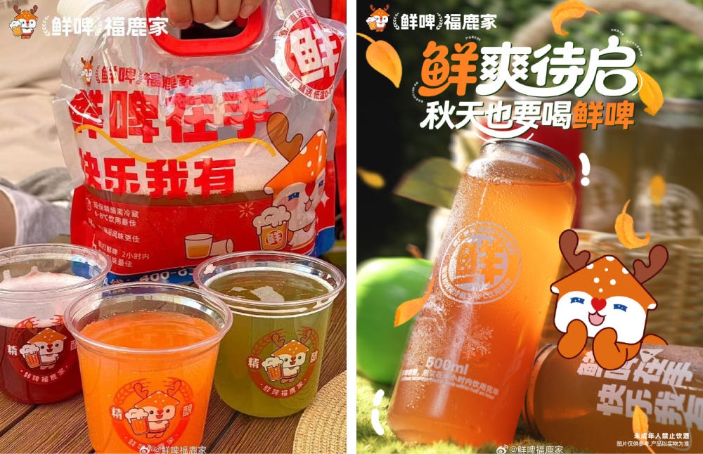 푸루자는 2021년에 시작한 중국의 생맥주 프랜차이즈로, 불과 4년 만에 약 1,200개 매장을 운영 중이에요. 대표 상품인 독일식 생맥주는 500ml에 5.9위안(약 1,180원), 과일 맥주는 9.9위안(약 1,980원)에 판매하고요. 밀크티와 거의 같은 가격대죠. ‘어른들의 밀크티, 살짝 취하는 행복’이라는 브랜드 슬로건처럼, 젊은 세대의 첫 맥주 경험을 겨냥한 초저가 브랜드예요.