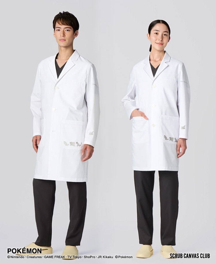 이에 도쿄의 메디컬 어패럴 전문 브랜드, ‘클라시코(Classico)’가 나섰어요. 일본인이라면 남녀노소 누구나 사랑하고 알아볼 수 있는 애니메이션 ‘포켓몬’과 컬래버레이션을 한 거예요. 2025년 8월에는 4마리의 포켓몬이 수놓아져 있는 의사 가운을 출시했죠. 소매 끝에는 피카츄가, 왼쪽 앞주머니에는 꼬부기, 이상해씨, 파이리가 있어요. 흰색 가운에서 너무 튀지 않도록 알록달록한 캐릭터 대신 캐릭터들의 상징적인 실루엣을 회색 자수로 표현했어요.