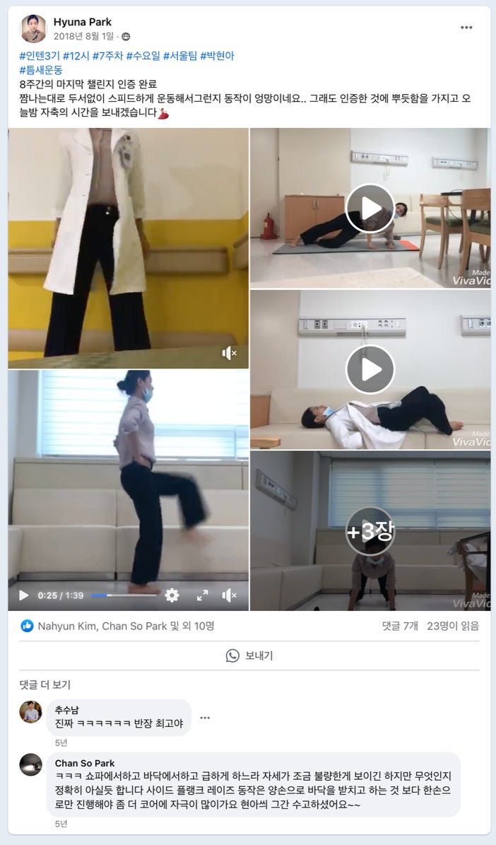 평일에는 페이스북 그룹을 통해 지점별로 매일 운동 영상이 올라가고, 회원들이 따라하는 영상을 찍어올립니다. 주말에는 헬스장의 빈 GX룸에 모여 그룹 트레이닝을 받았고요. 콘텐츠가 중요하다는 생각에 트레이닝 커리큘럼을 5,000개 이상 만들기도 했습니다. 체대 입시 학원을 운영했던 경험이 큰 보탬이 됐죠.