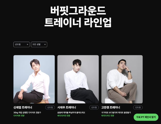 피트니스 업계에서 신뢰가 가장 취약했던 분야는 PT입니다. 기존의 문제는 회원들이 PT를 등록할 때 어떤 트레이너를 만나게 될지 알 수 없는 상태로 결제를 해요. 버핏서울은 이 문제를 해결하기 위해 고객이 퍼스널 트레이너를 선택하는 구조로 바꿨어요. 홈페이지에 소속 트레이너들을 모두 공개하고, 회원의 성향에 맞게 큐레이션해 고객이 선택할 수 있도록요.