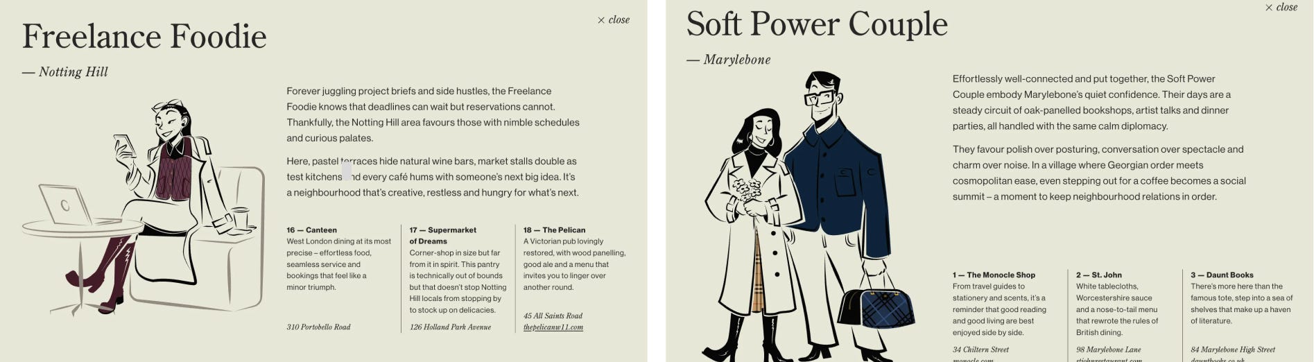 예를 들어볼게요. 노팅힐은 프로젝트와 부업을 동시에 하면서도, 맛집 예약은 놓치지 않는 ‘프리랜스 푸디(Freelance Foodie)’라는 캐릭터로 소개해요. 유연한 일정과 새로운 맛을 즐기는 사람이 잘 어울리는 동네라는 뜻이죠. 반면, 메릴본은 조용한 자신감과 절제된 세련됨을 가진 ‘소프트 파워 커플(Soft Power Couple)’로 설명해요. 화려한 허세보단 차분한 대화가 어울리는 메릴본의 분위기를 커플의 이야기로 풀어낸 거예요.