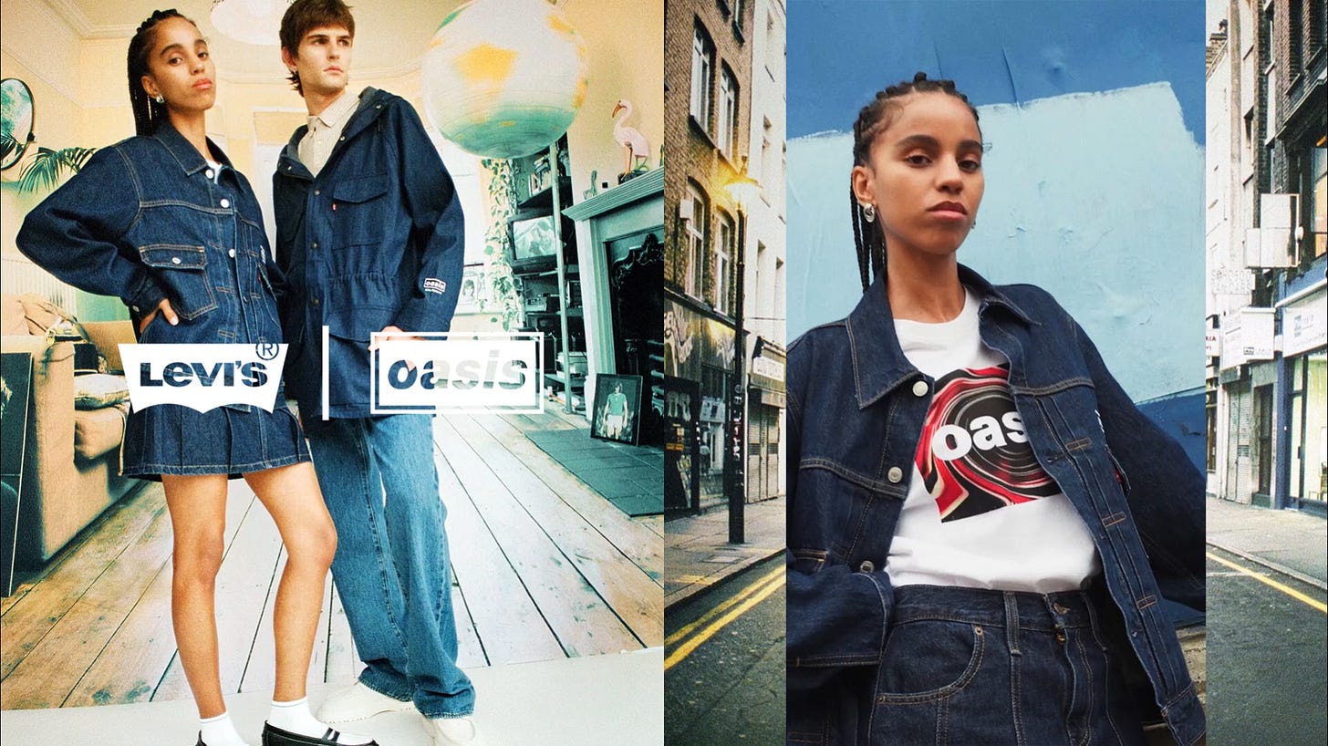 이 흐름에 맞춰 패션 브랜드들도 발 빠르게 오아시스 콜라보 컬렉션을 내놓았어요. 그중 리바이스는 ‘투어를 위한 준비(TOUR-READY STYLE)’ 라인을 선보이며 주목을 받았죠. 오아시스 로고가 박힌 밴드 티셔츠부터 재킷, 파카까지. 콘서트에 어울리는 패션으로, 팬들의 마음을 사로잡았어요.